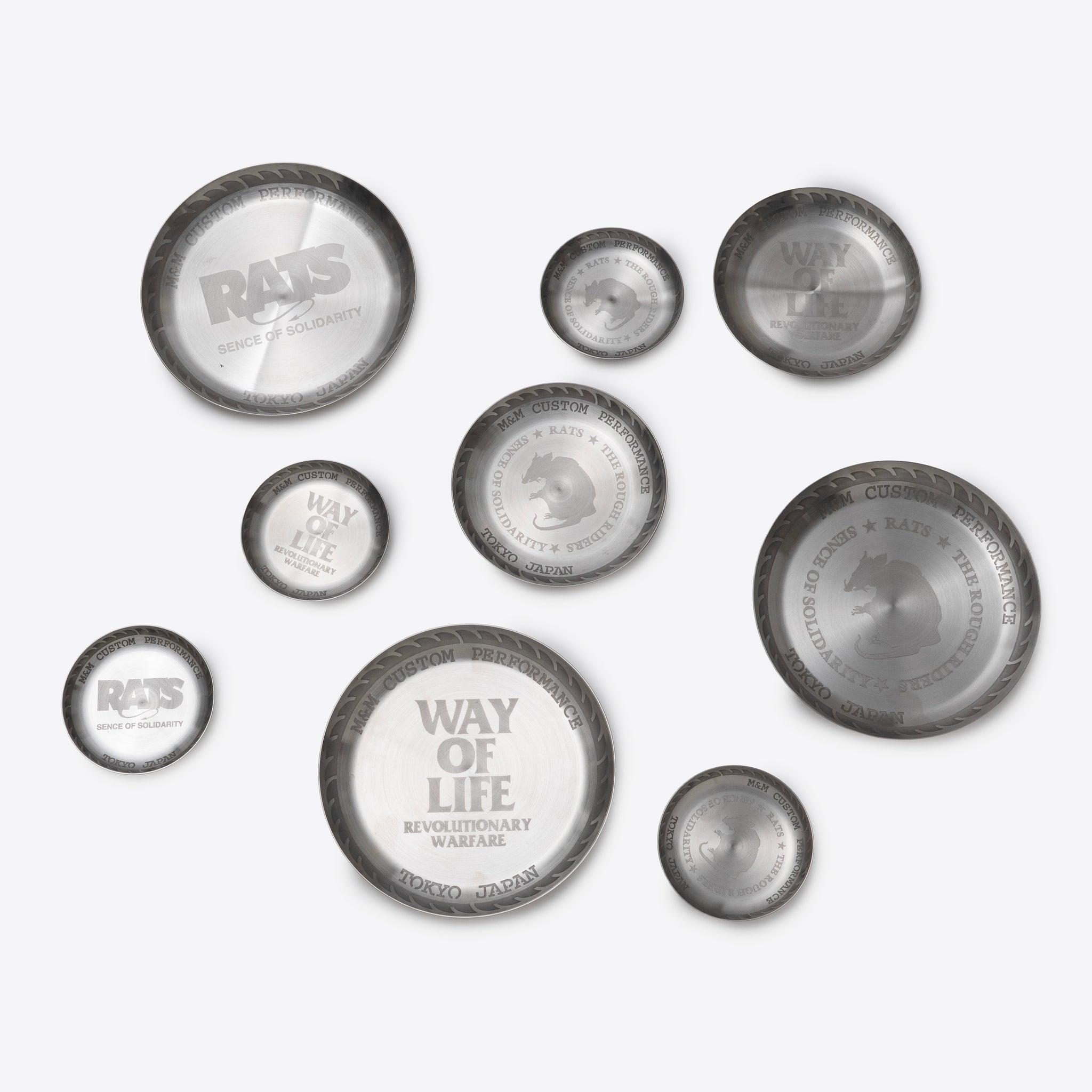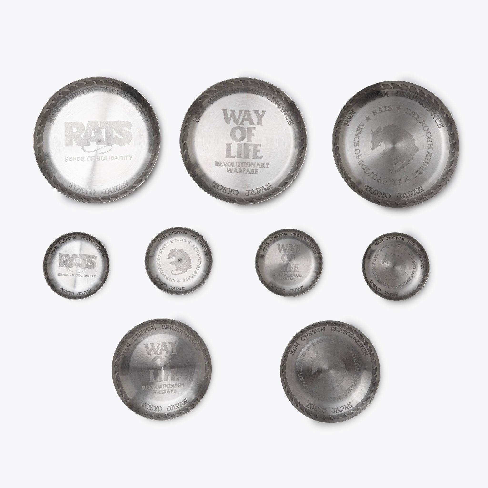 アルミ素材を使用したM&M定番のメタルソーサー。底面デザインはRatモチーフ、WAY OF LIFERATSボックス型ロゴの3種類、サイズもS/M/L3サイズで展開するので、用途に応じた使い分けが可能。11サイズ展開。<M&M CUSTOM PERFORMANCE>とのコラボレーションモデル。