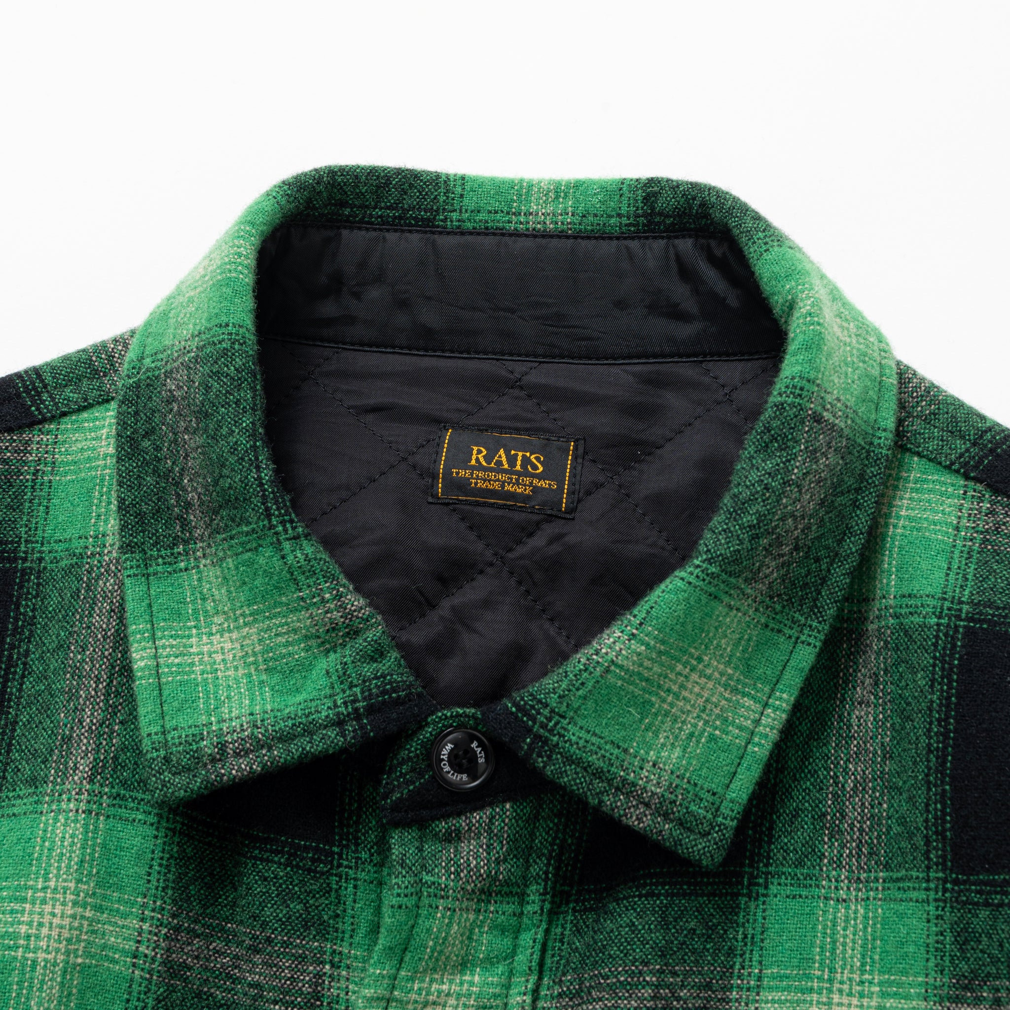 表面を微起毛させたオリジナルウールチェック素材、裏地に中綿入りダイヤキルティング生地を採用したシャツジャケット。両胸にパッチポケット、袖はシングルカフ、襟型はレギュラー、ポケットはバイヤス、とクラシックな意匠を盛り込み仕上げてある。全てのボタンには“RATS”WAY OF LIFE”の刻印入り。左胸ポケット脇にピスネームが配置。ややゆとりのあるシルエット。製品にてワンウォッシュ済み。15サイズ展開。