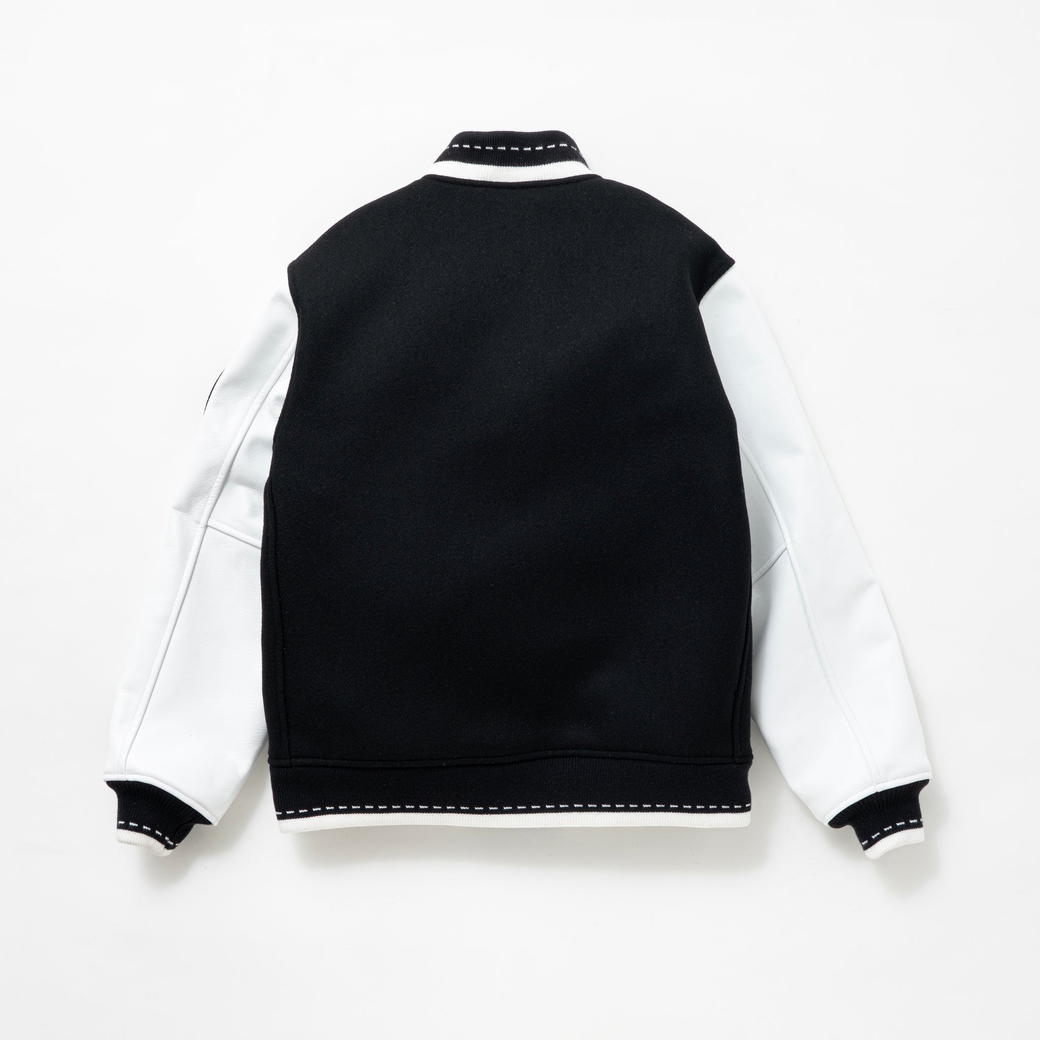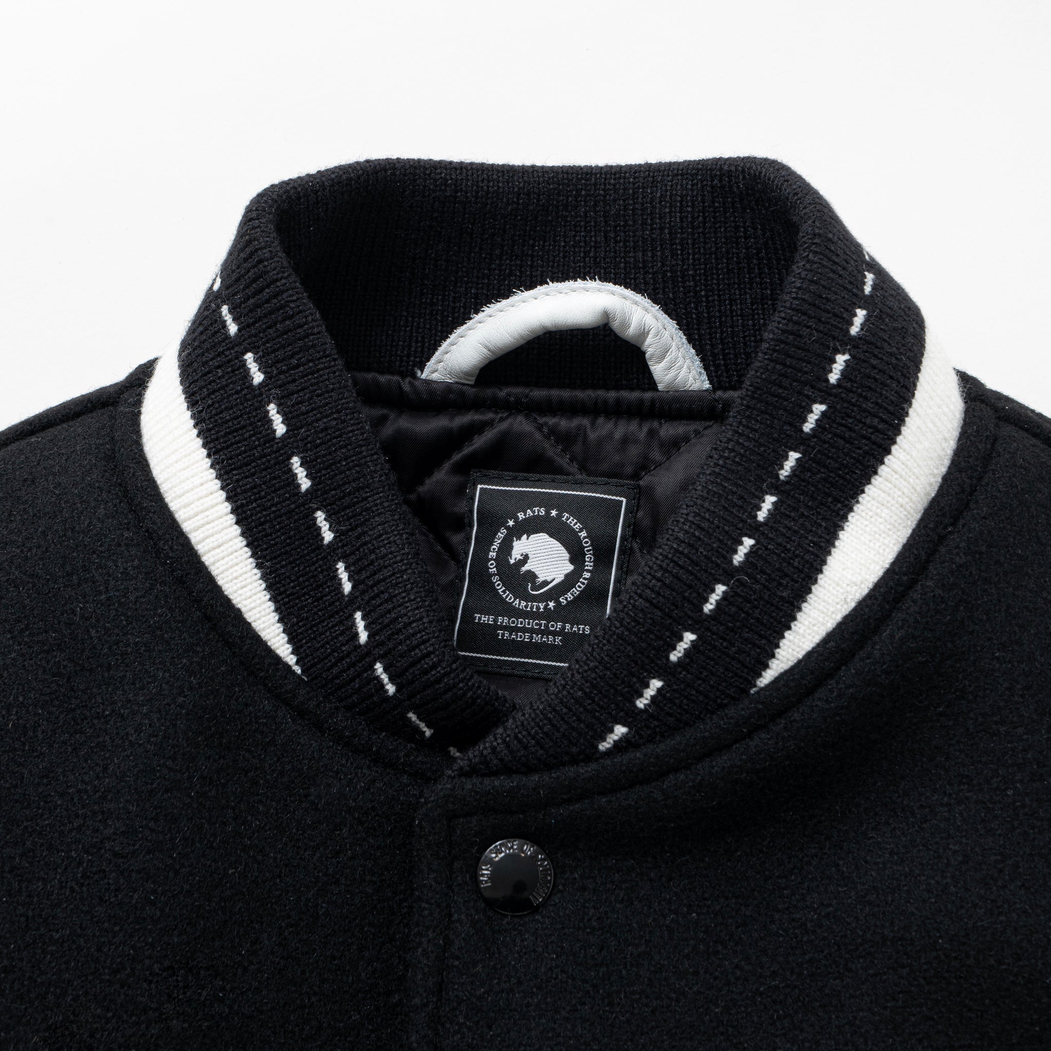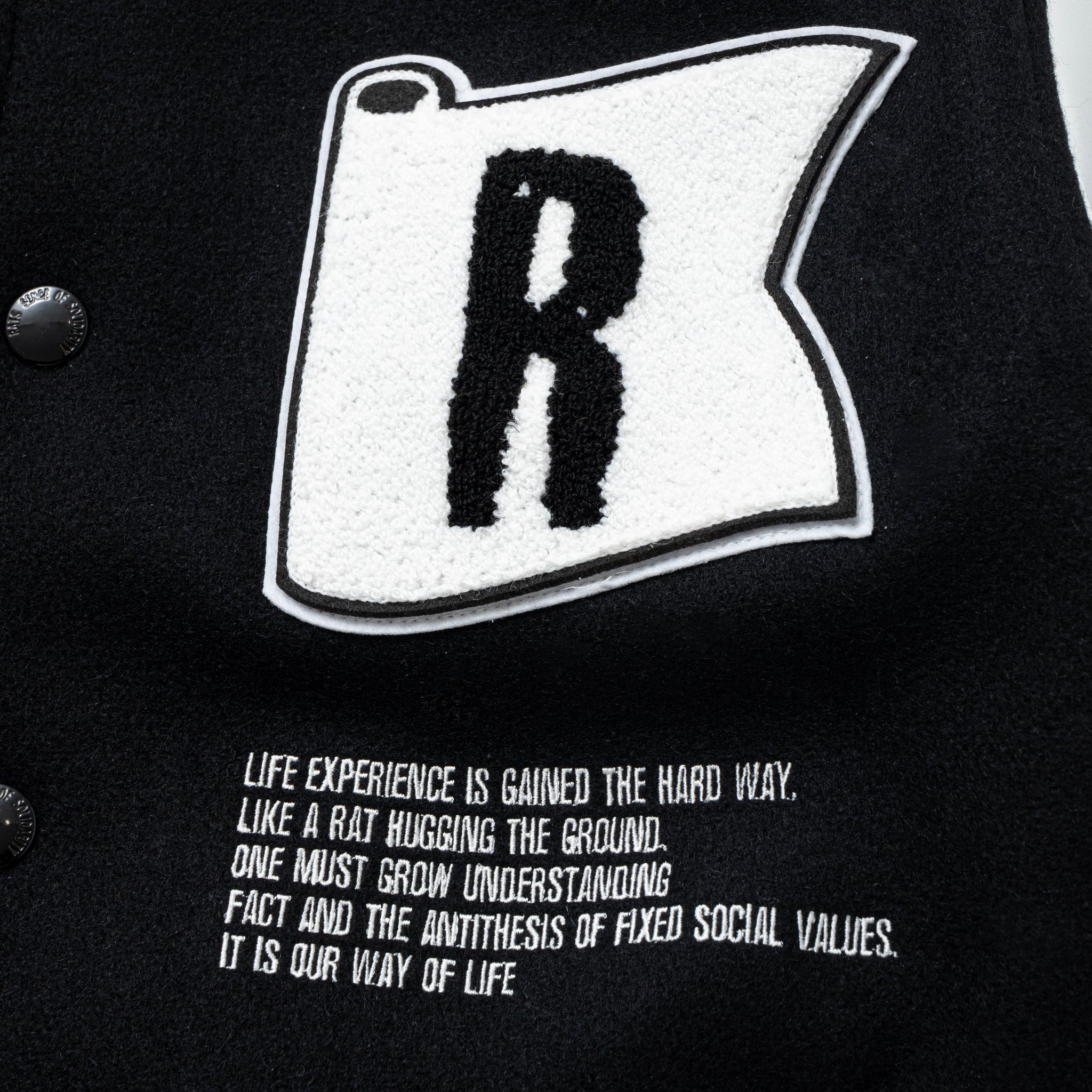 身頃はメルトン生地、スリーブにカウレザーをコンビネーションで使用したヴァーシティジャケット。左胸にRフラッグのサガラワッペン・レターグラフィックを直刺繍、左肩にサークル型フェルトワッペン、袖上に03ナンバリングのフェルトワッペンを叩きつけ、RATSが掲げるメッセージやアイコンを随所に散りばめたデザイン。身頃の両脇にスラッシュポケット、身頃内側にスリつとポケットを配置。裏地はダイヤキルティング仕様、リブはオリジナル柄を採用。レギュラーフィットシルエット。1色5サイズ展開。