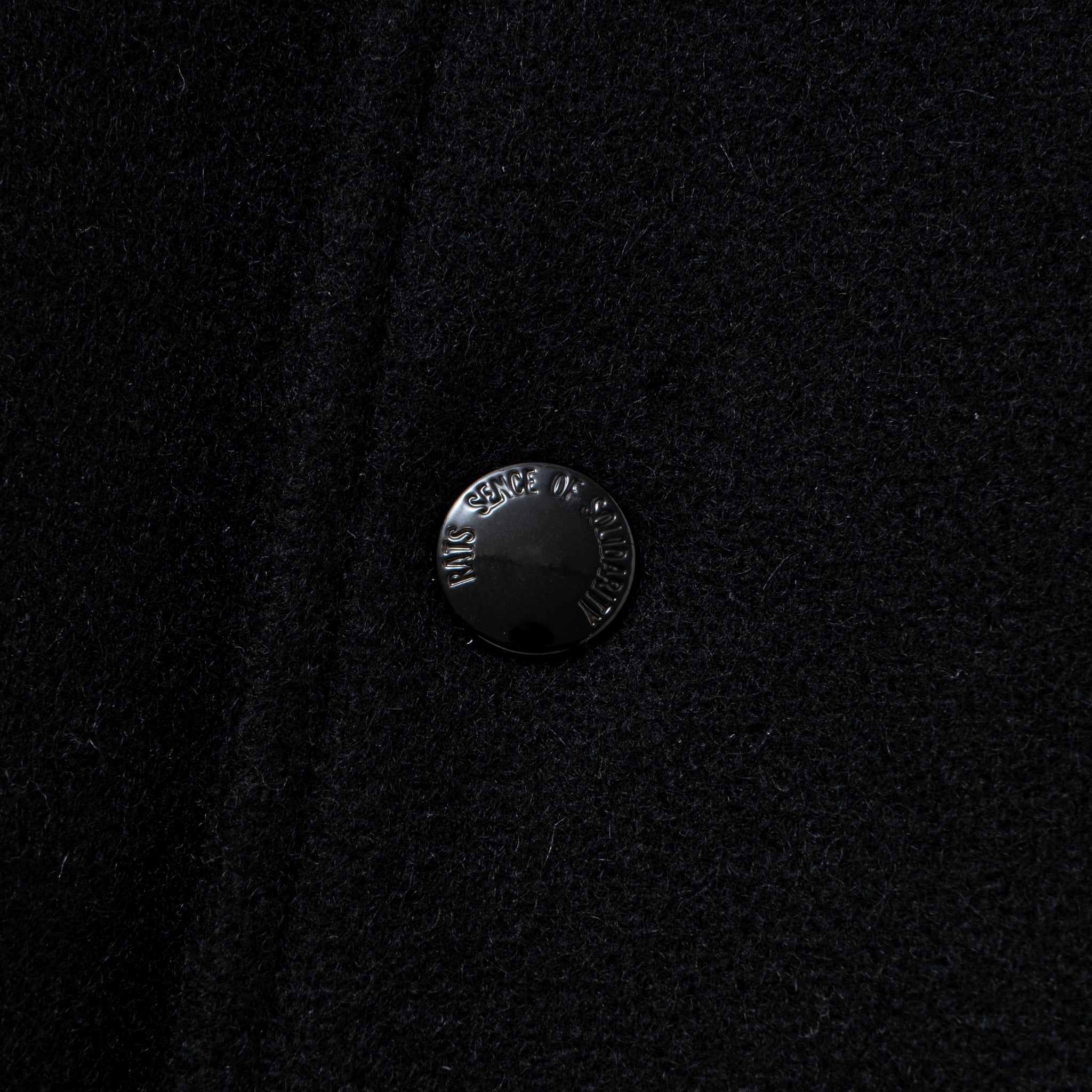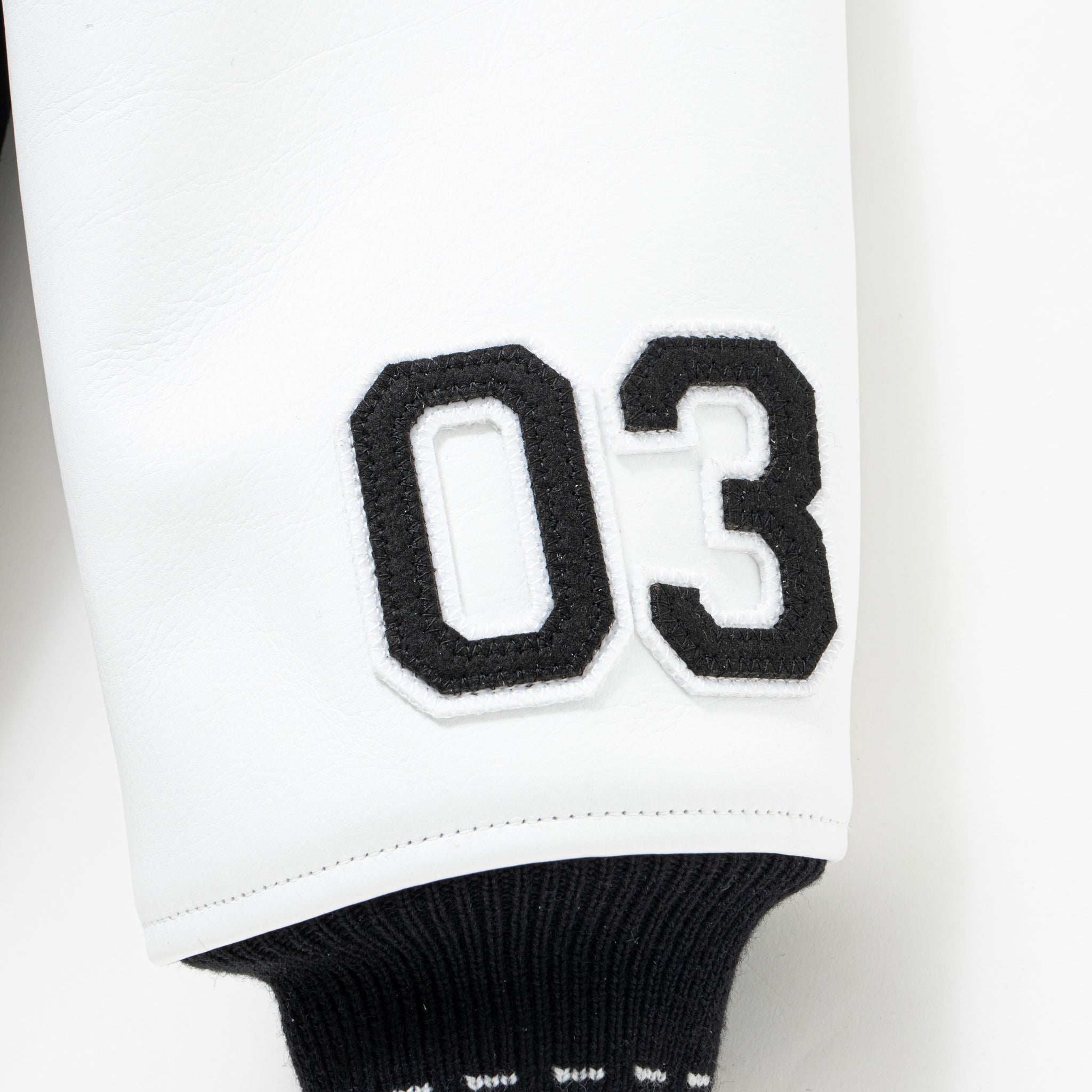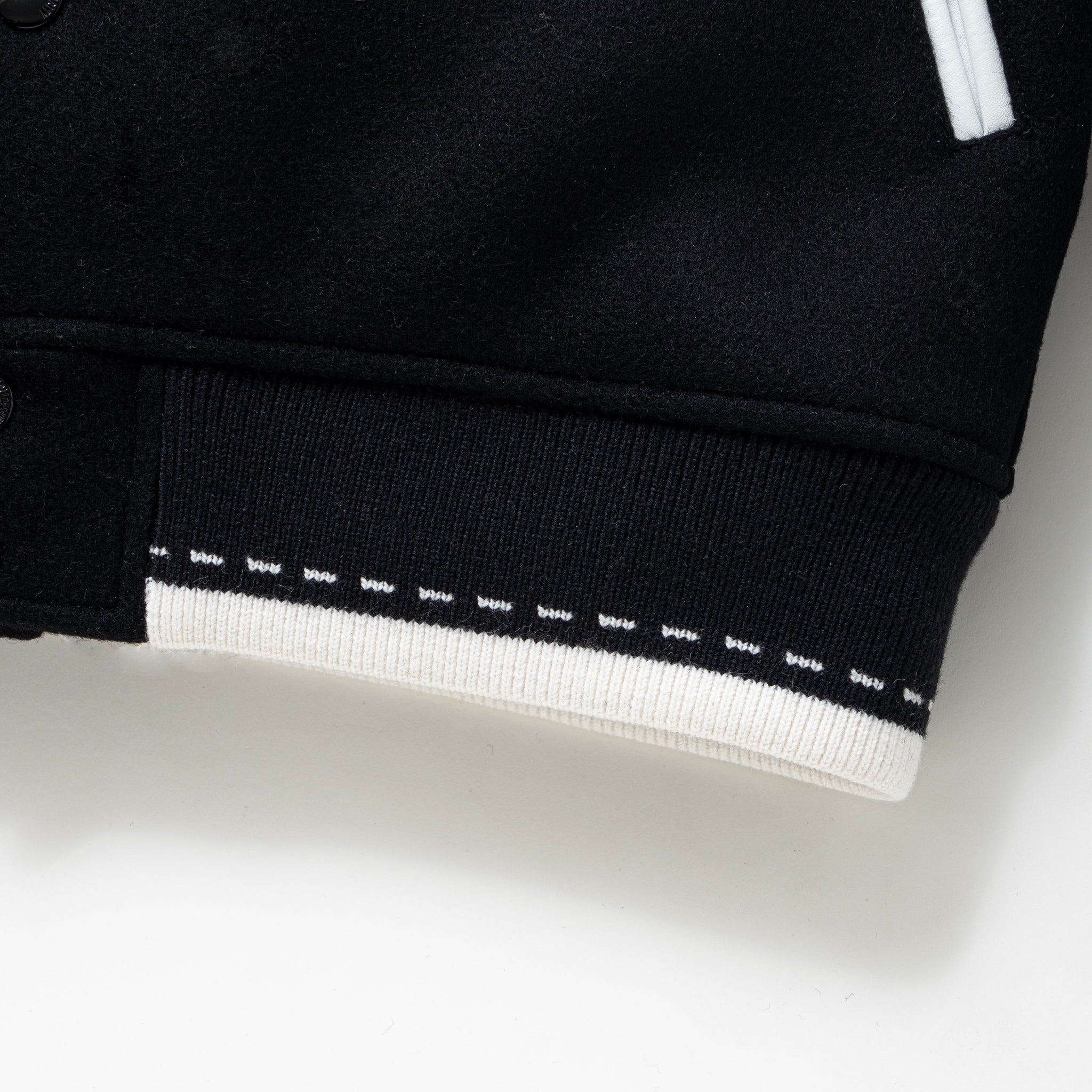 身頃はメルトン生地、スリーブにカウレザーをコンビネーションで使用したヴァーシティジャケット。左胸にRフラッグのサガラワッペン・レターグラフィックを直刺繍、左肩にサークル型フェルトワッペン、袖上に03ナンバリングのフェルトワッペンを叩きつけ、RATSが掲げるメッセージやアイコンを随所に散りばめたデザイン。身頃の両脇にスラッシュポケット、身頃内側にスリつとポケットを配置。裏地はダイヤキルティング仕様、リブはオリジナル柄を採用。レギュラーフィットシルエット。1色5サイズ展開。