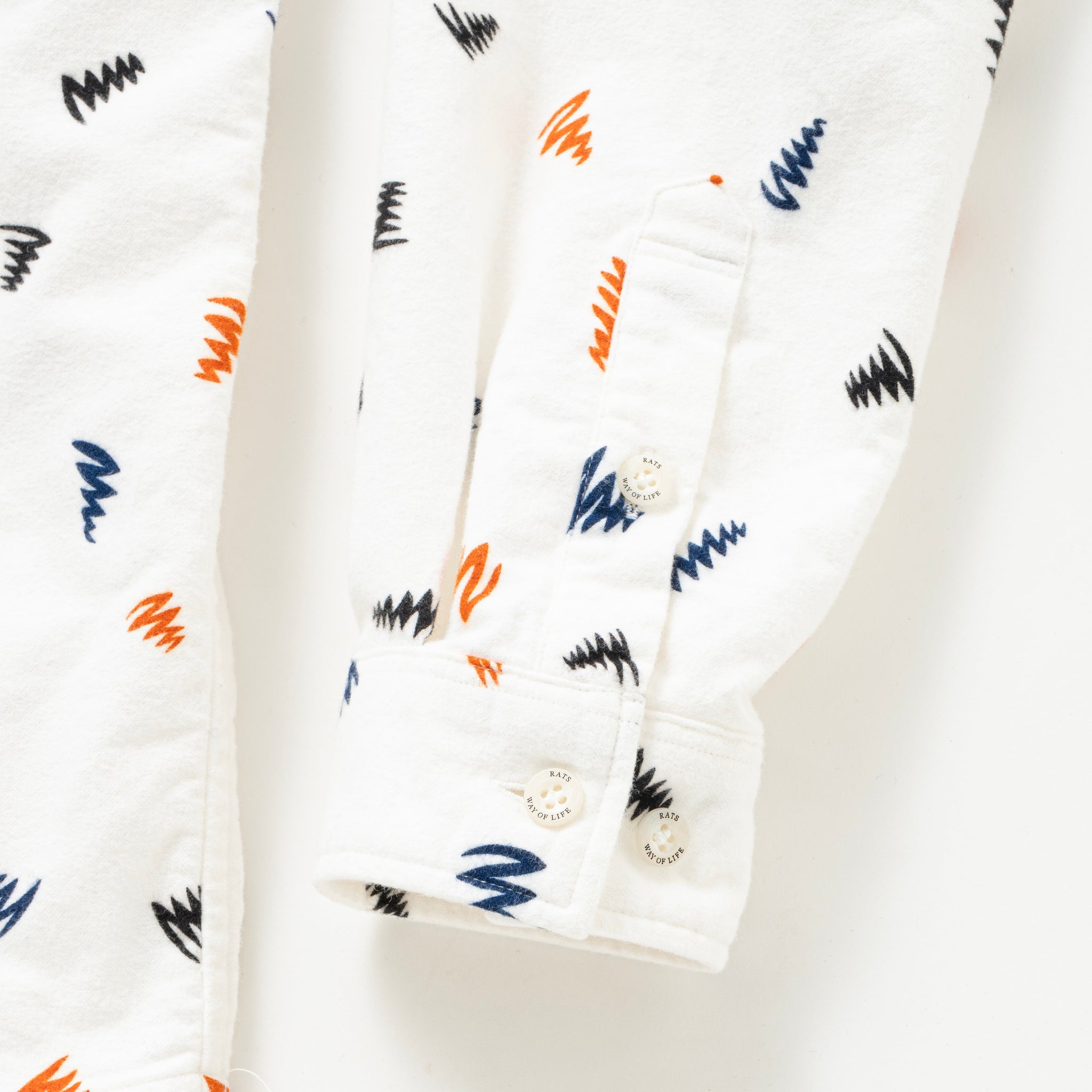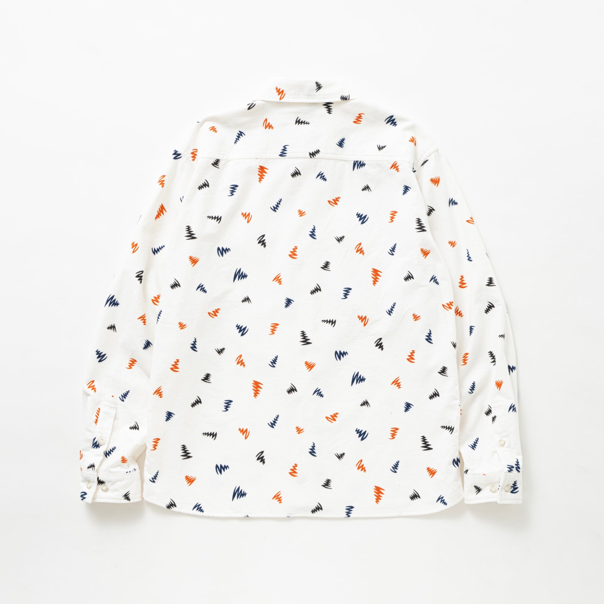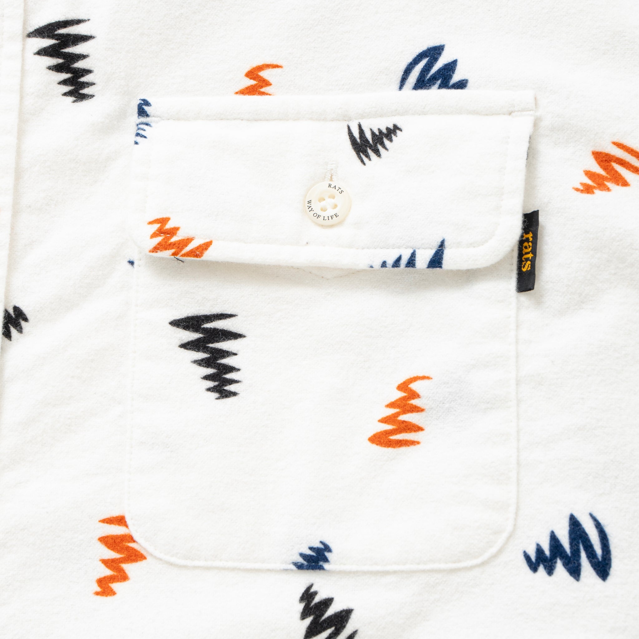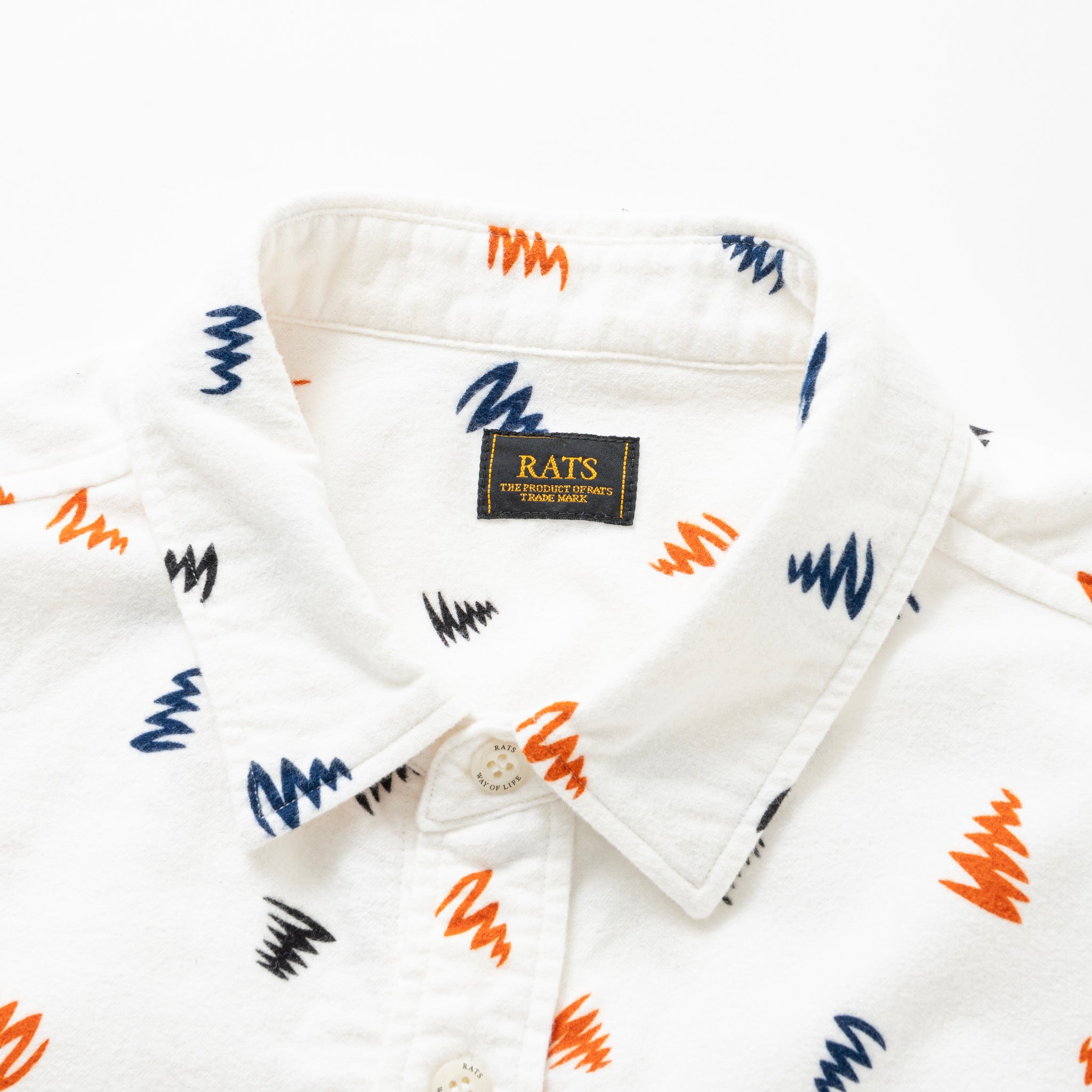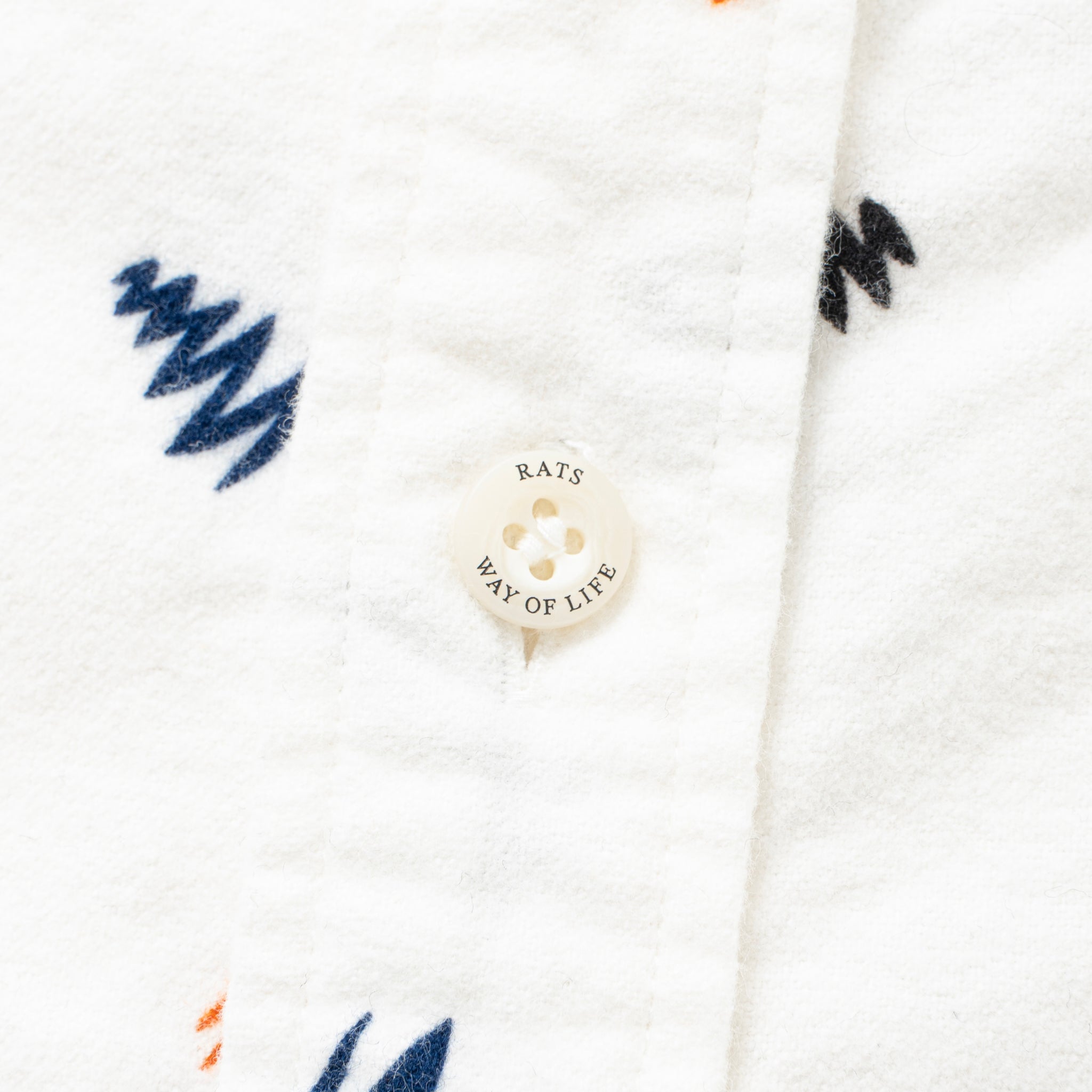 表面を微起毛させたコットンフランネル生地を使用したレギュラーカラーシャツ。50sのヴィンテージに見られたモチーフをRATS流に表現したアートワークを全面プリントで配置。胸元左右にフラップポケットを配置、左ポケット脇にピスネームを挟み込み。前立て・袖口に使用したボタンは“RATS”・“WAY OF LIFE”の刻印入りオリジナルを採用、ワンウォッシュ仕上げ。袖は剣ボロ仕立て、裾は緩やかなラウンドカット。レギュラーフィットシルエット。1色5サイズ展開。