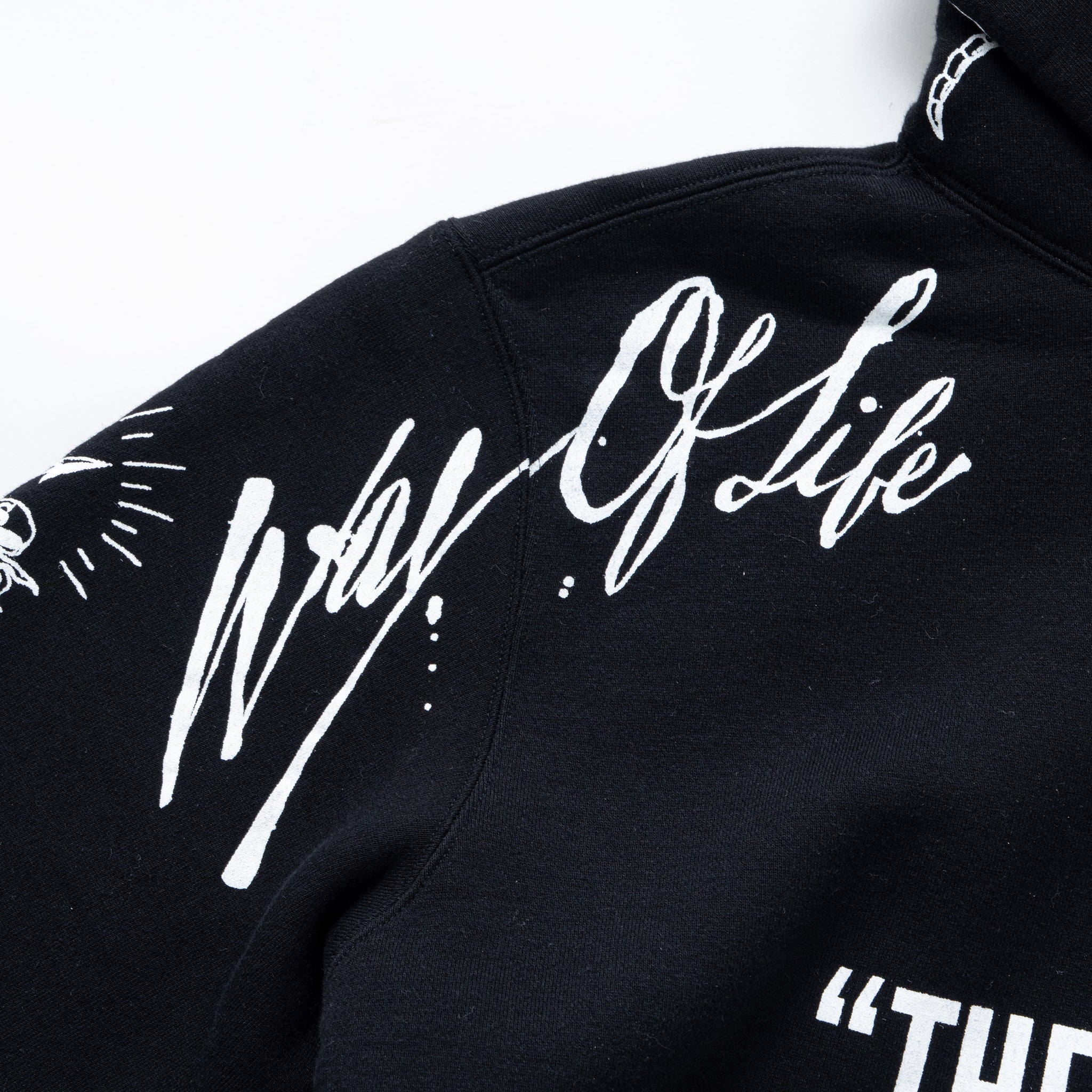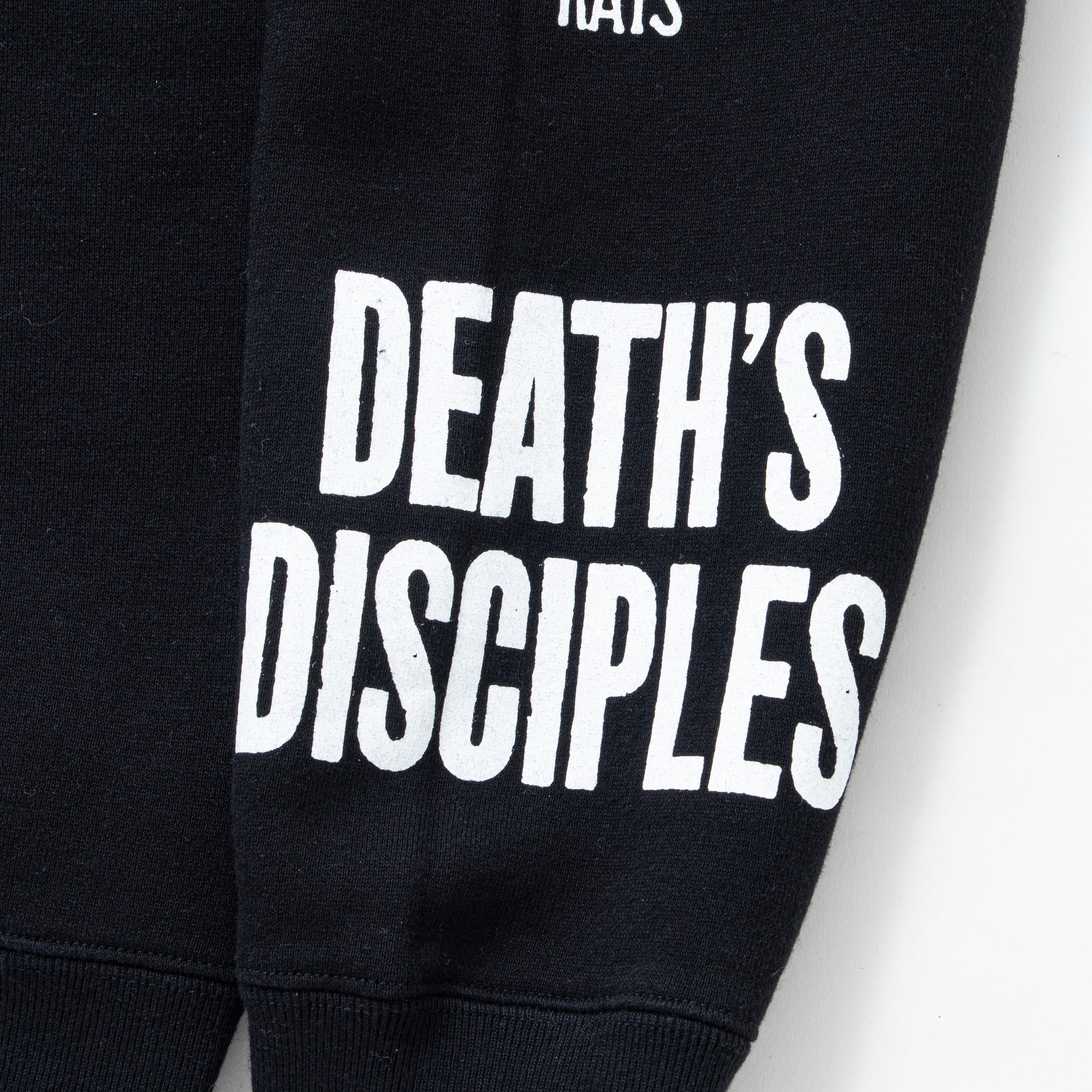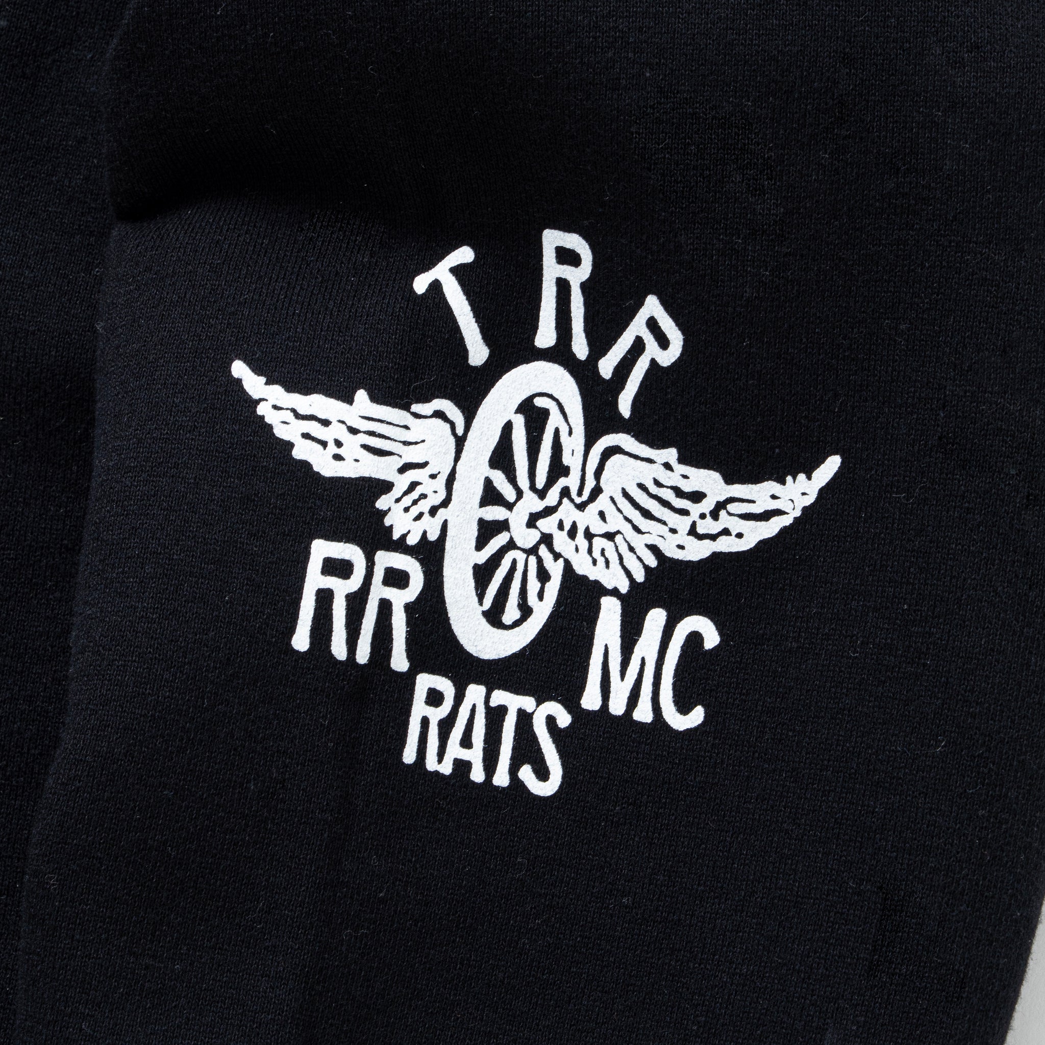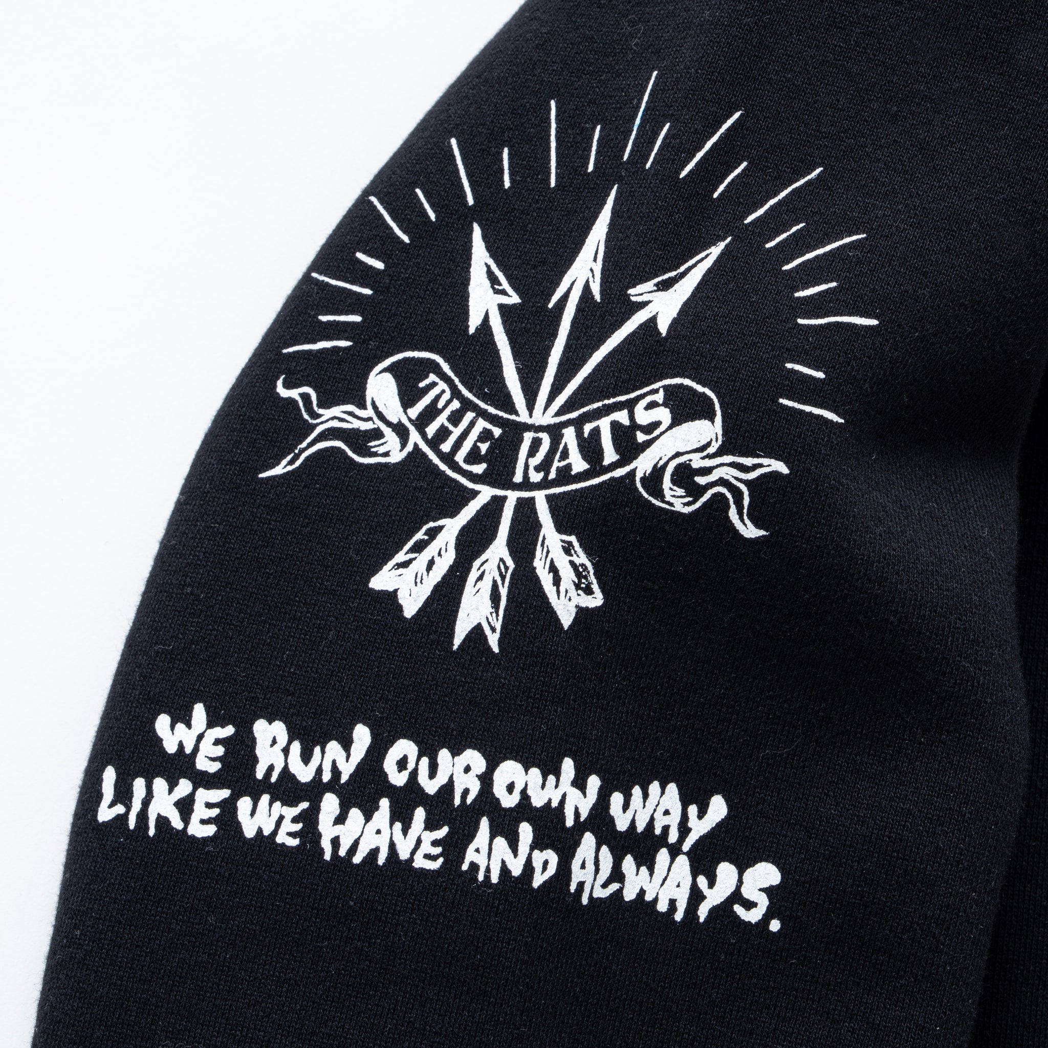 13oz.のコットン裏毛を起毛させた素材を使用したクロスネックフーディー。フロント・バック・スリーブの各所にRATSと交友関係の深いアーティストが手がけた歴代のアートワークをラバープリントで表現したインパクトあるデザイン。腹部にはポケット縁をバインダー仕上げをしたマフポケットを配置。襟元はブランドがオリジナルで開発したクロスネックに仕立てた防風性の高い意匠。身頃はややタイトなシルエット。製品にてワンウォッシュ済み。1色5サイズ展開。