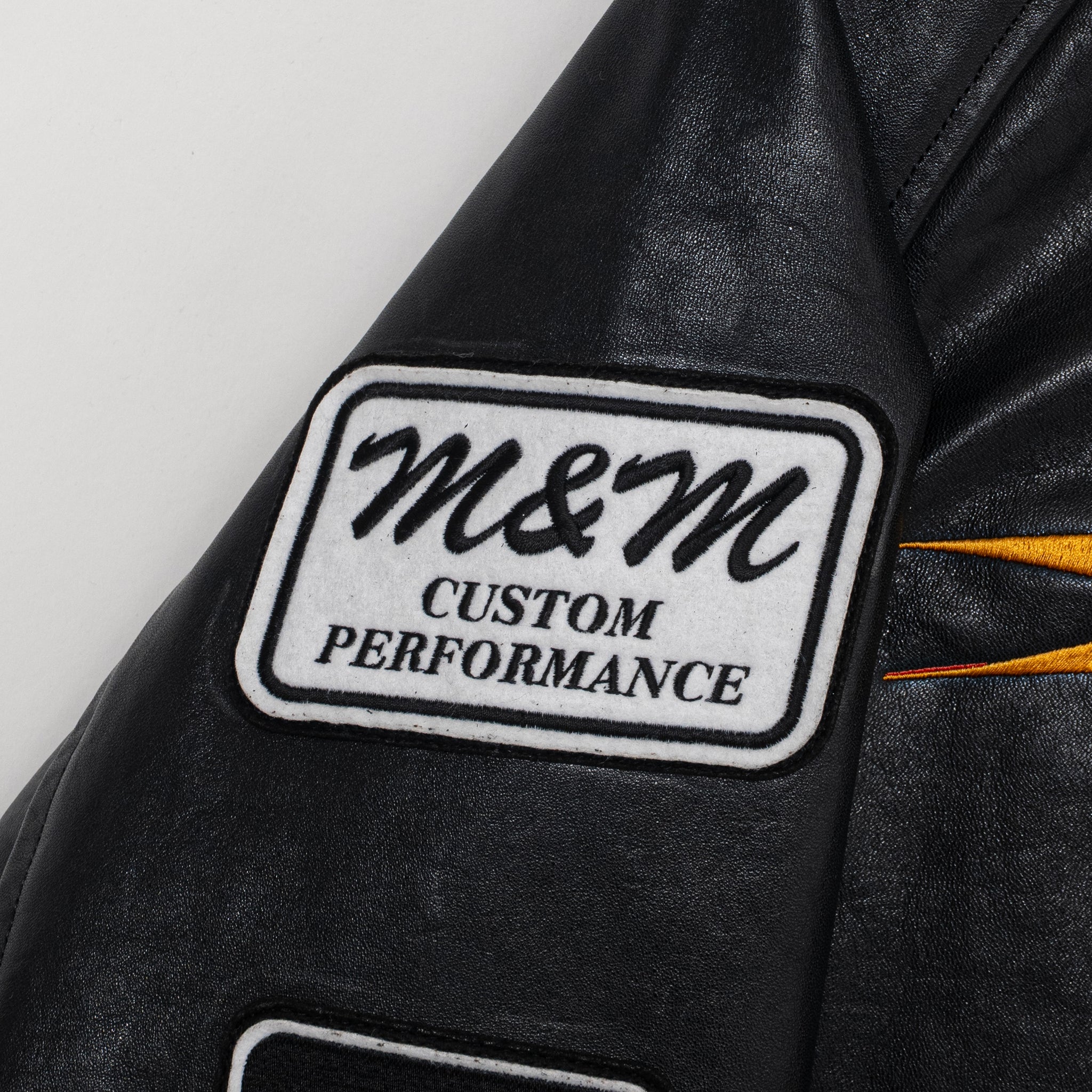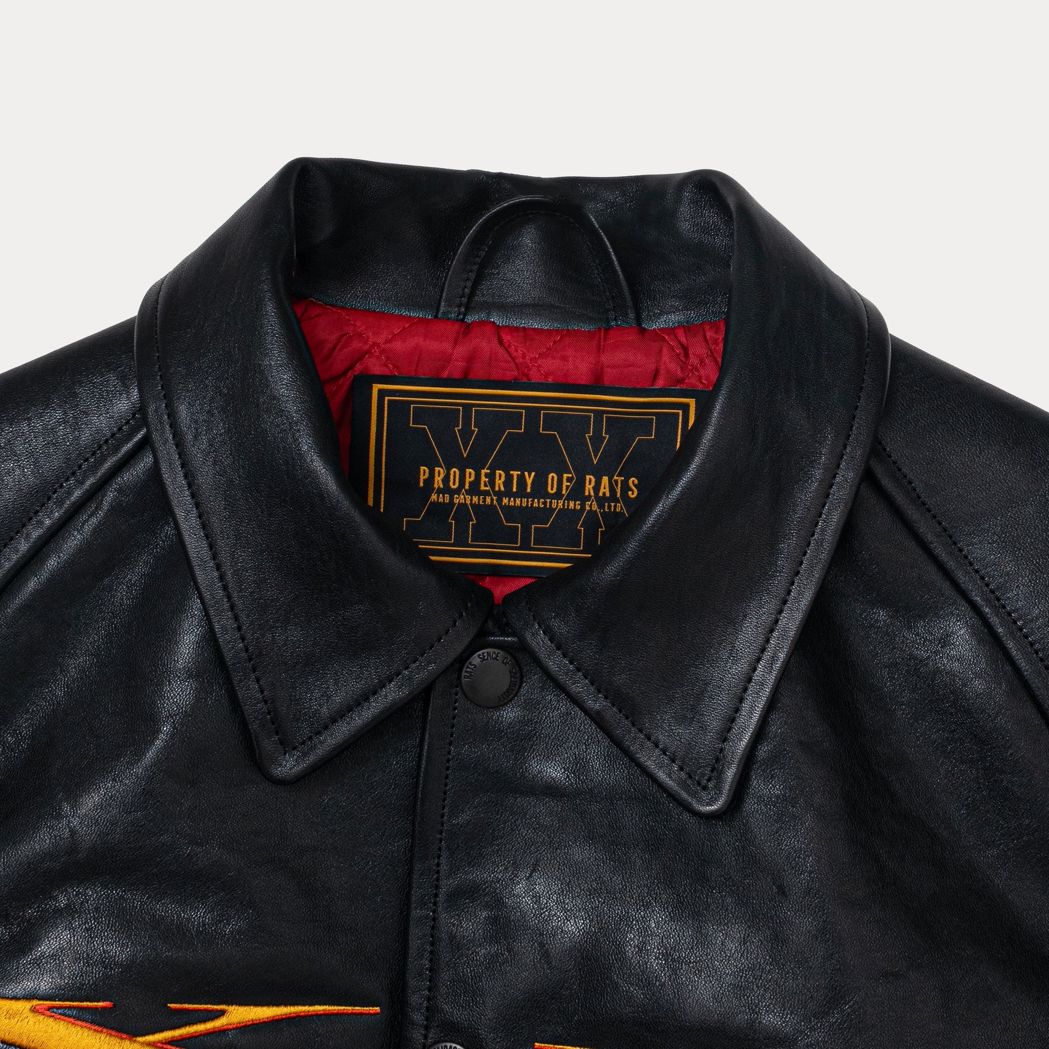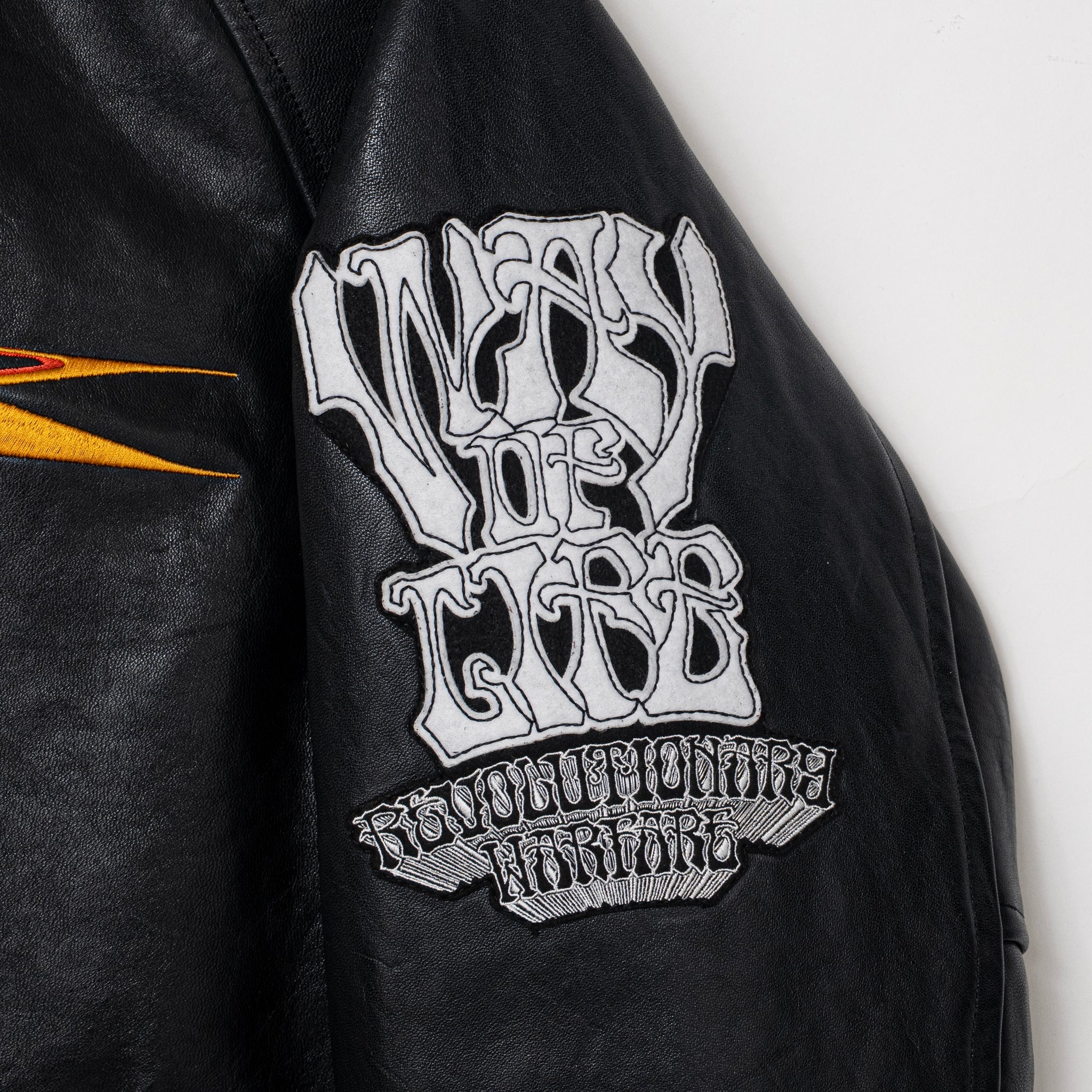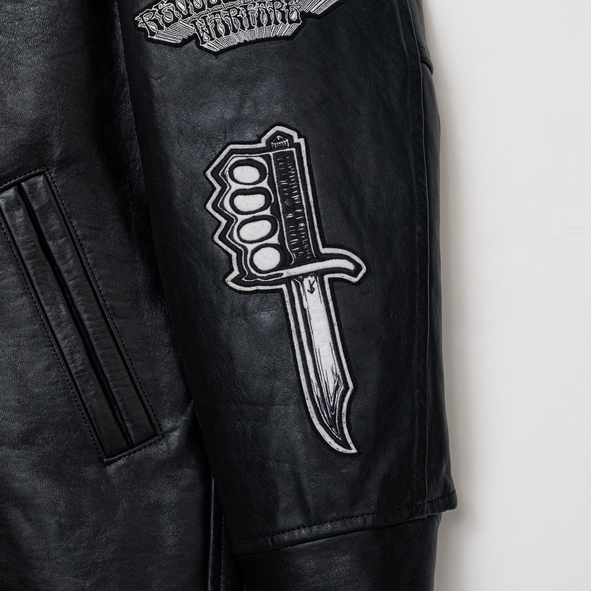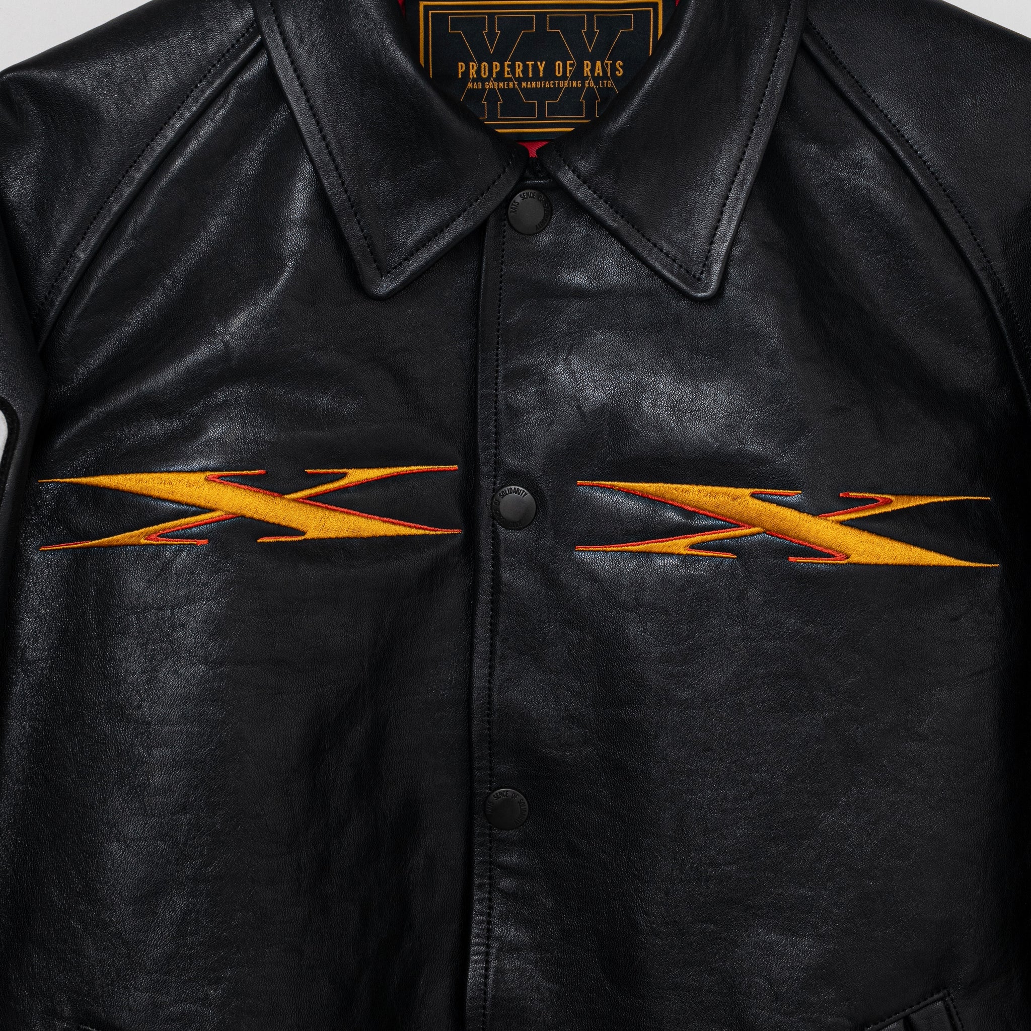 光沢豊かで厚みのある肉感のホースレザーを贅沢に使用したレザーコーチジャケット。胸元にXXロゴ、背面にはFAMILIA XXSENCE OF SOLIDARITYのグラフィックを立体刺繍で表現したデザイン。両腕には本シリーズでコラボレーションを果たした5ブランドのワッペンを叩きつけ。ワッペンは、フェルト素材で2mm厚に仕上げた。両脇にスラッシュポケット、左身頃内側にスリットポケットを配置。ポケットスレキは起毛素材、袖裏はコーデュロイ素材で切り替えた仕様。身幅にゆとりのあるシルエット。15サイズ展開。スペシャルステッカー付き、30着限定。