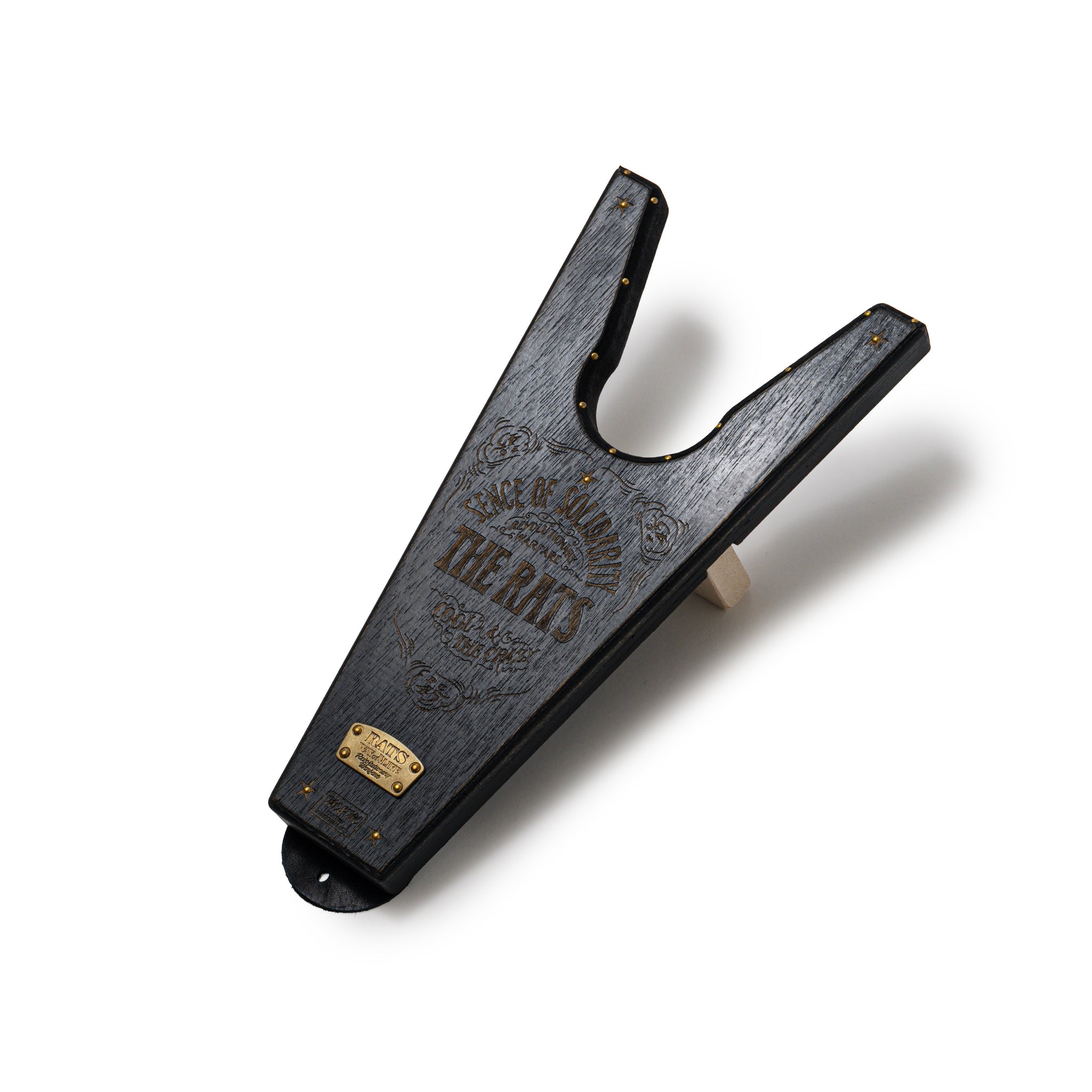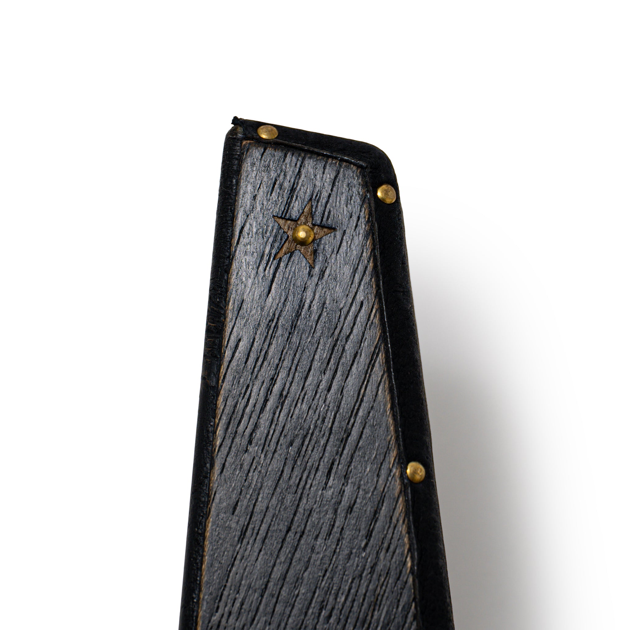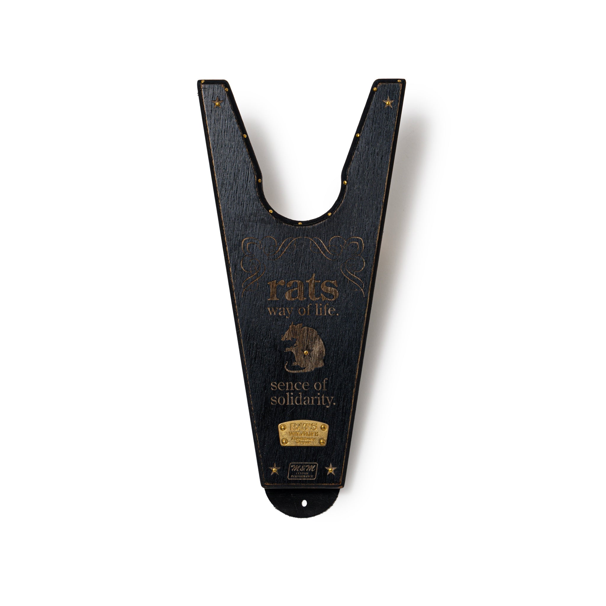 ウッド素材で作成したブーツジャック。表面をオールブラックで塗装。モチーフ下にゴールド配色のメタルプレート、上部先端左右の星の中にはスタッズが打ち込まれたデザイン。U字部分にはレザー張りで補強を施した仕様。1色1サイズ2タイプ展開。<M&M CUSTOM PERFORMANCE>とのコラボレーションモデル。