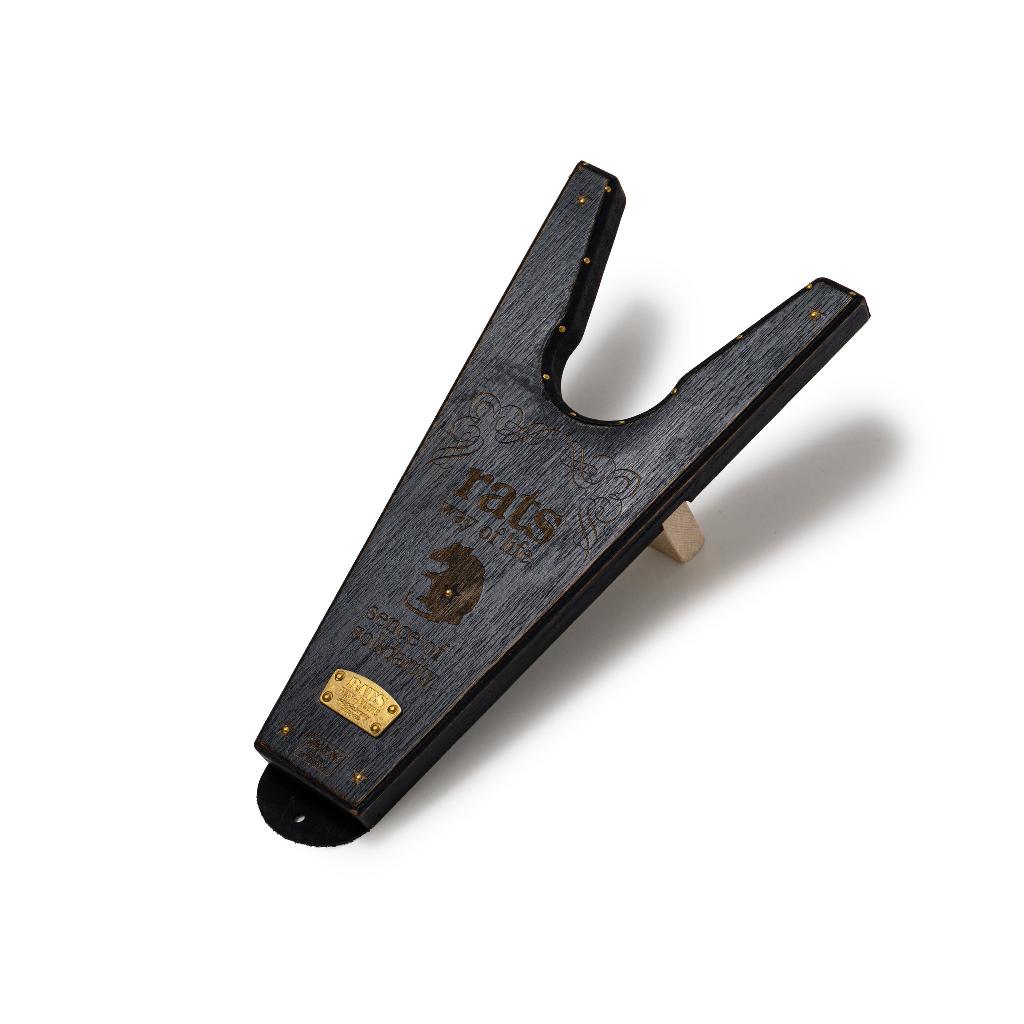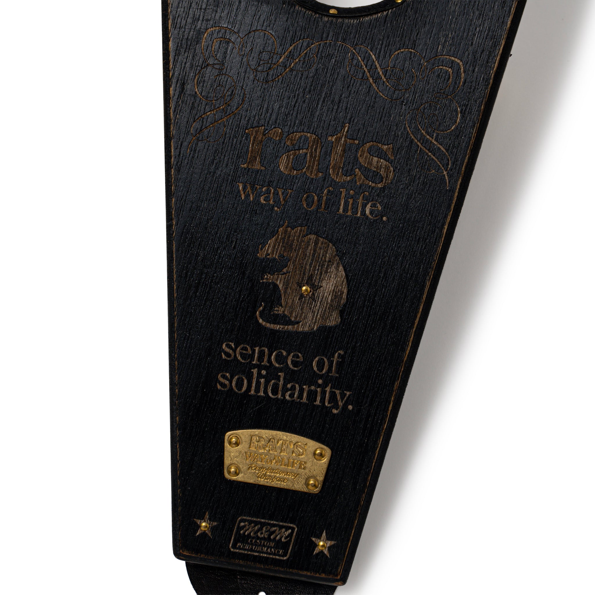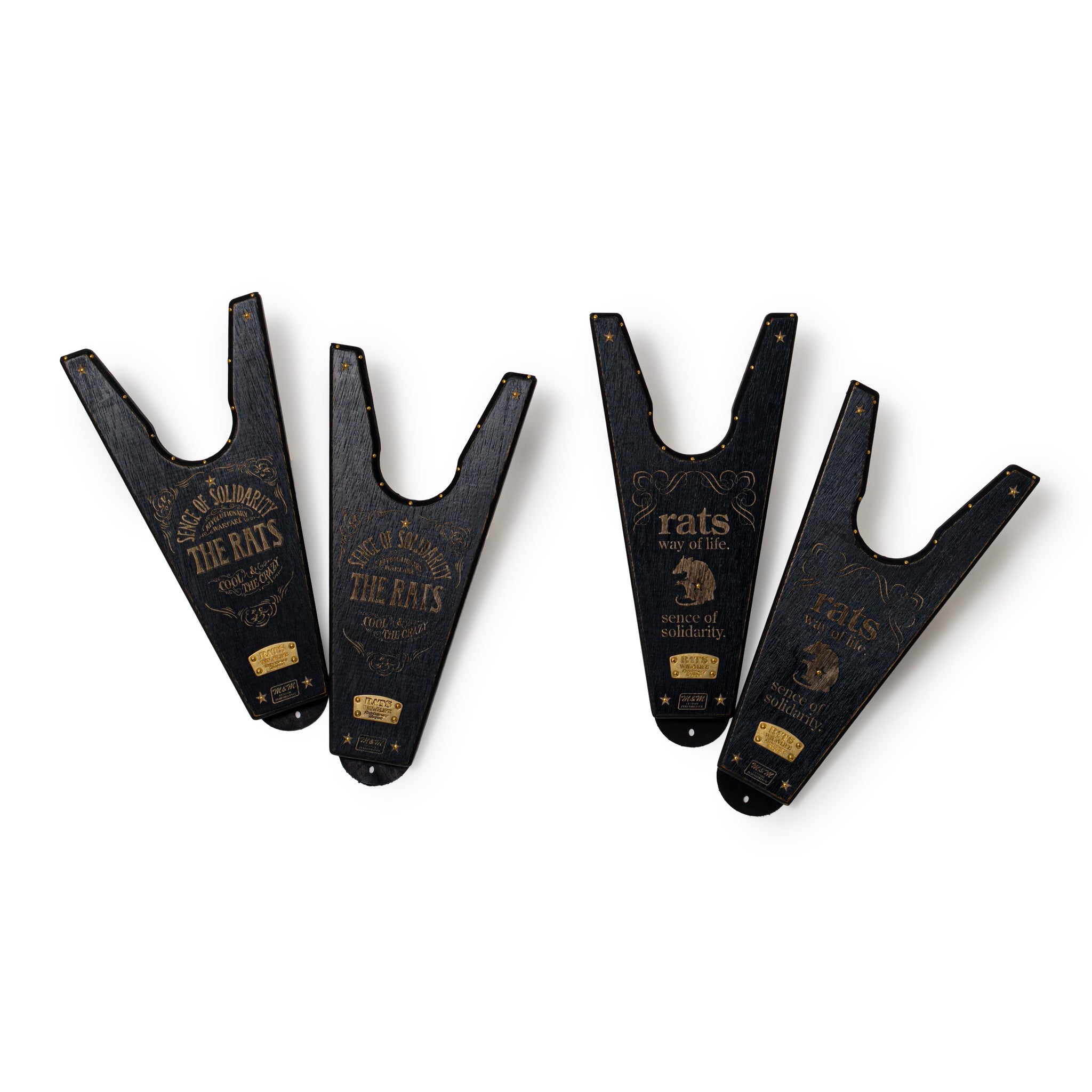 ウッド素材で作成したブーツジャック。表面をオールブラックで塗装。モチーフ下にゴールド配色のメタルプレート、上部先端左右の星の中にはスタッズが打ち込まれたデザイン。U字部分にはレザー張りで補強を施した仕様。1色1サイズ2タイプ展開。<M&M CUSTOM PERFORMANCE>とのコラボレーションモデル。