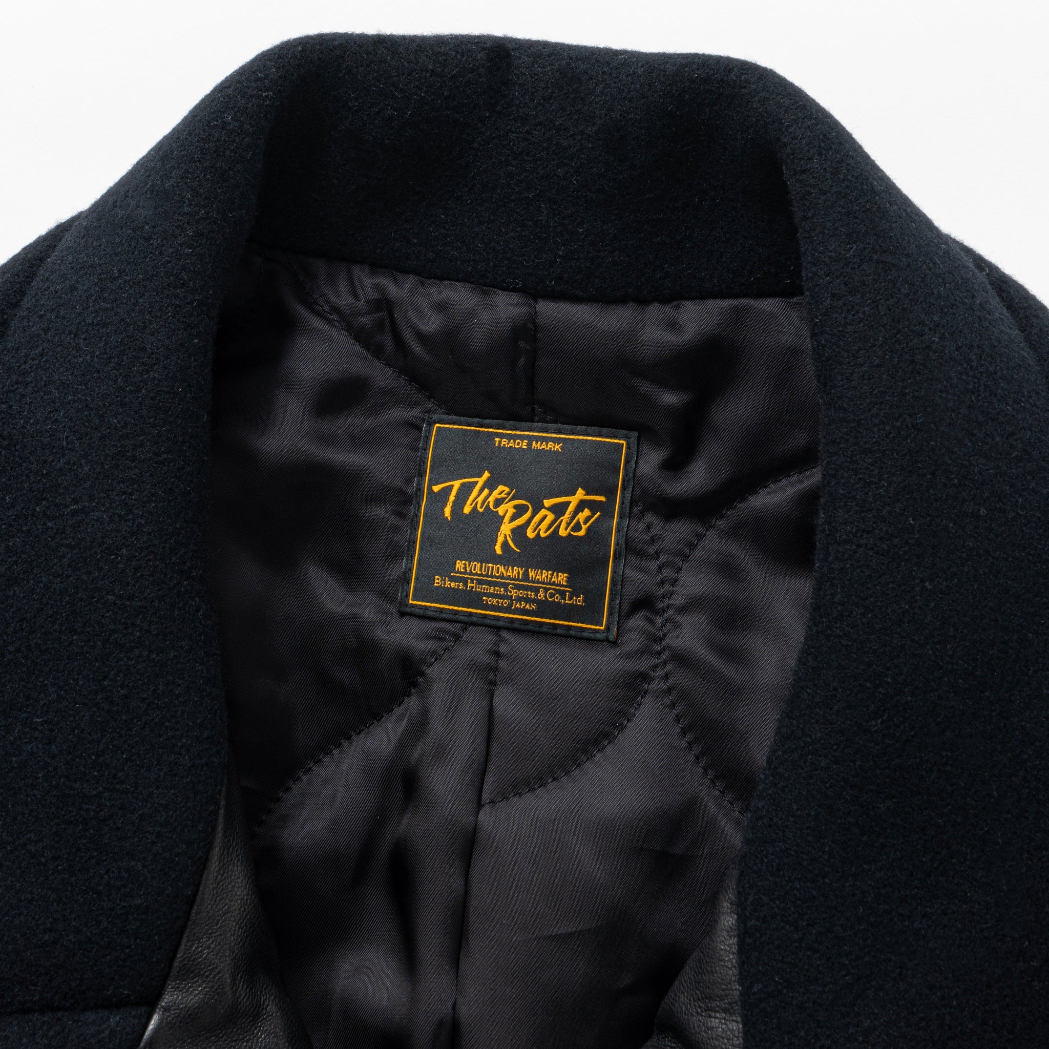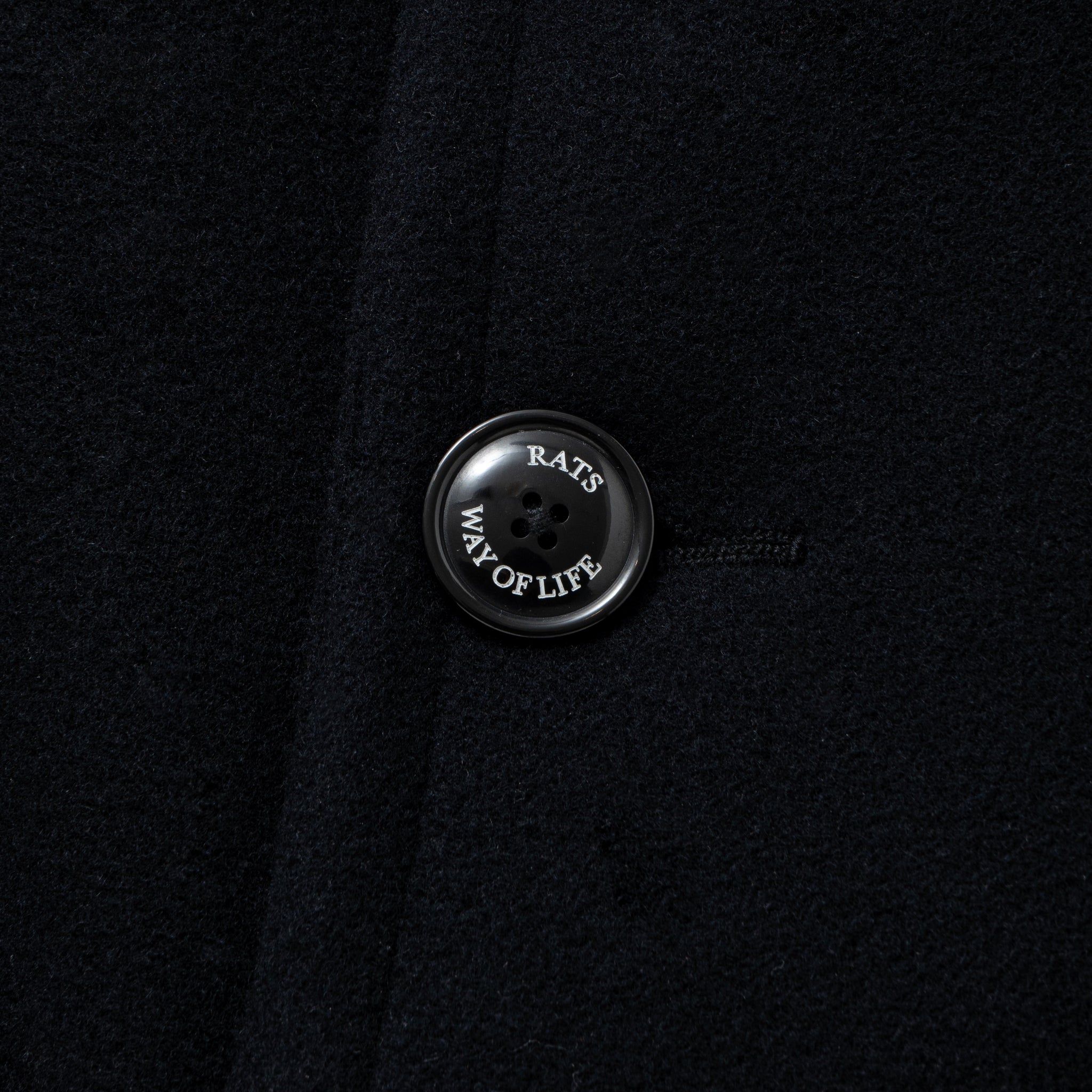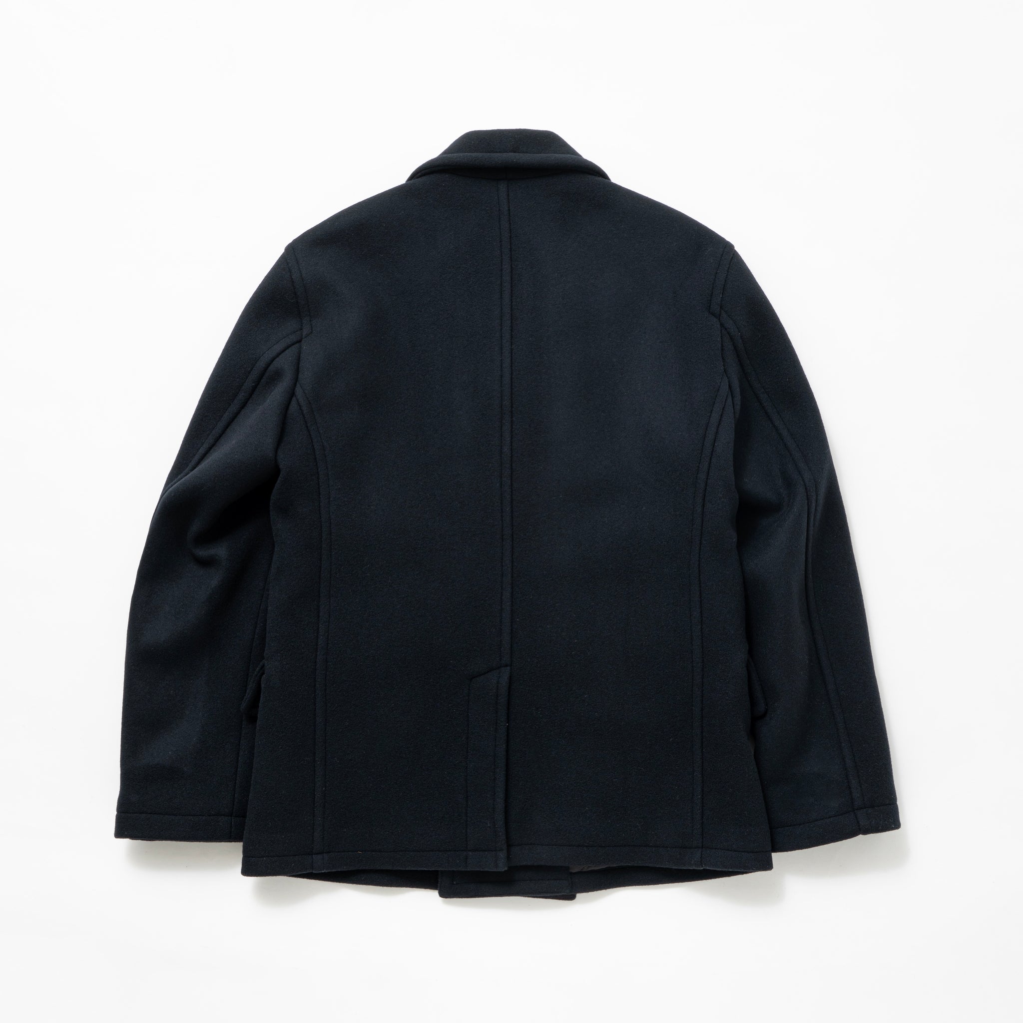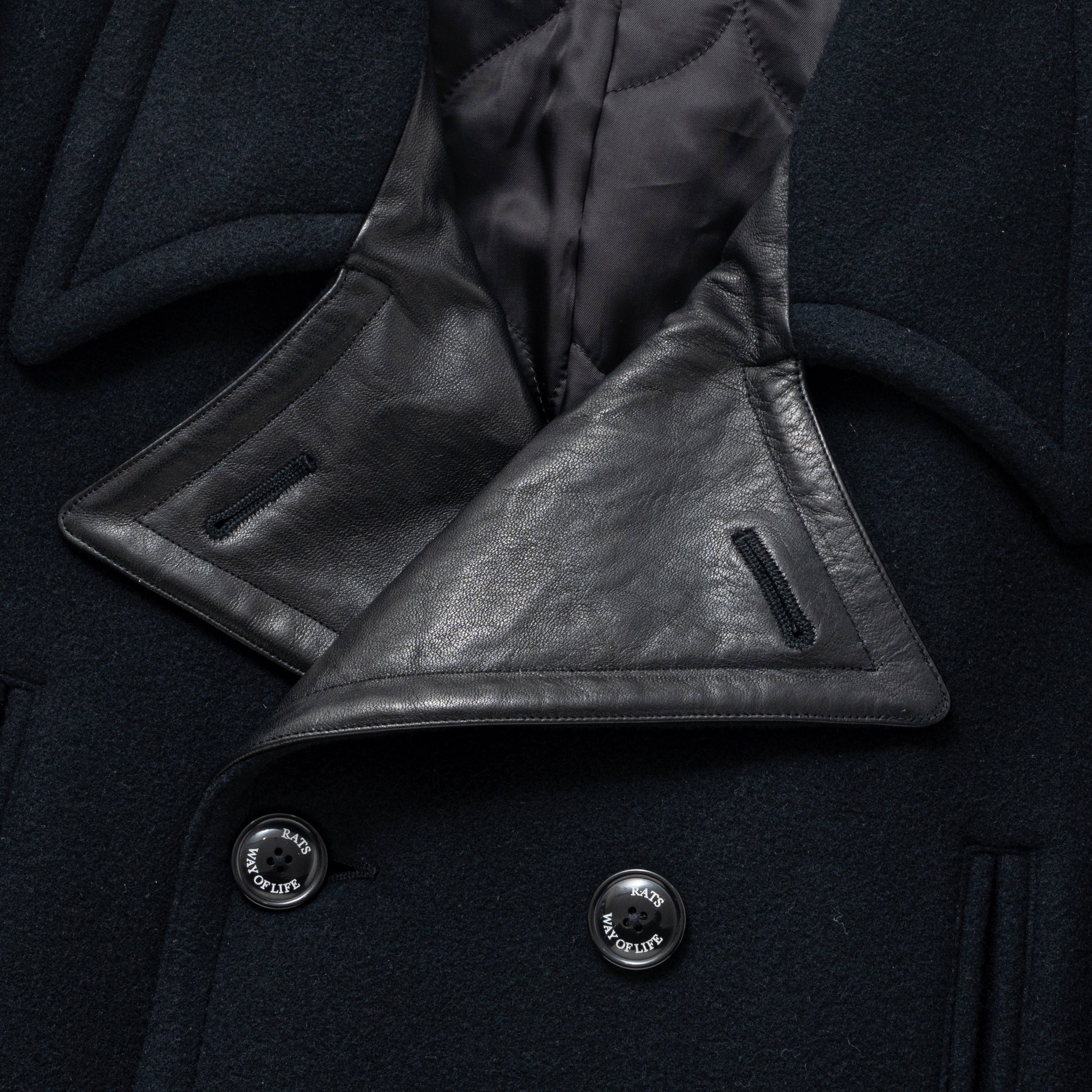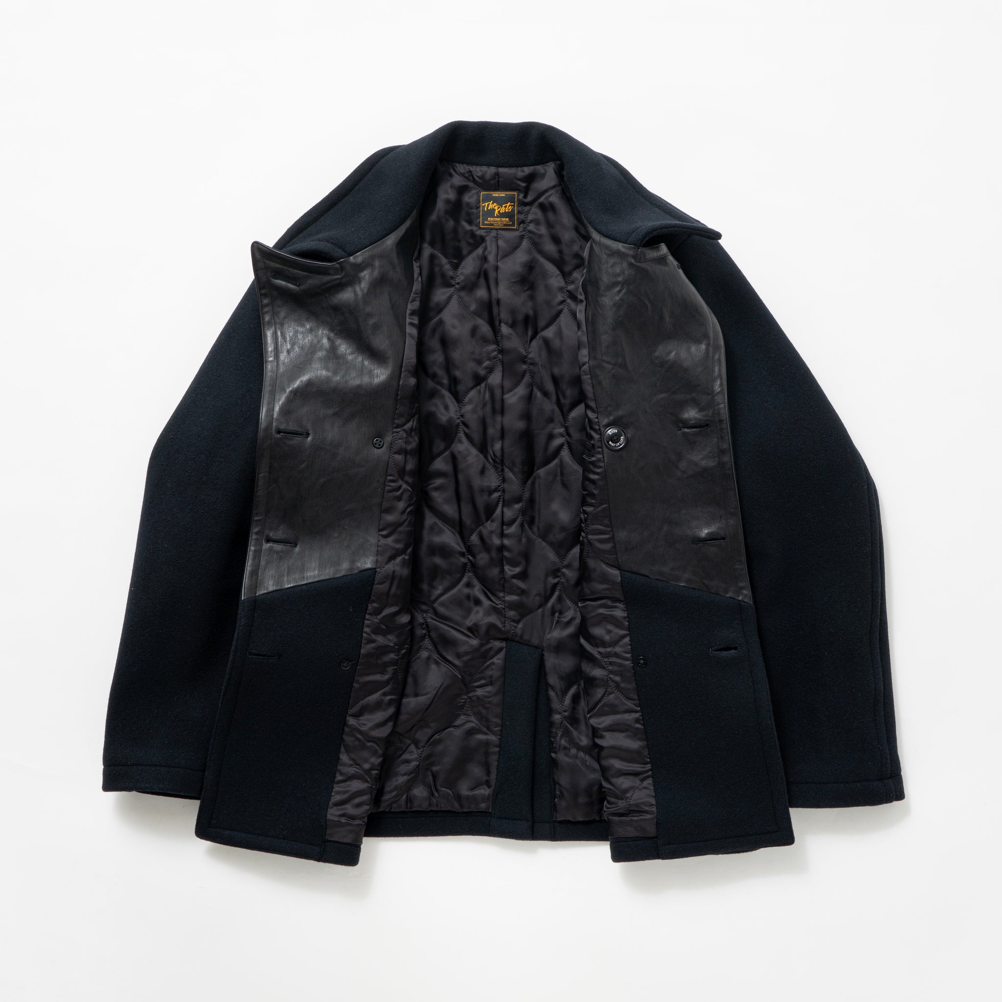 表地は軽量かつ光沢が豊か、保温性・しなやかさに富む上質なメルトン、裏地に中綿入り瓢箪キルトを使用したオリジナルのPコート。ラペルの下側をホースハイドレザーで切り替えた印象的なデザイン。両胸にハンドウォーマーポケット、両腰にフラップ付きポケット、身頃内側にスラッシュポケットを配置。前立てにはオリジナル刻印ボタンを採用。レギュラーフィットシルエット。15サイズ展開。