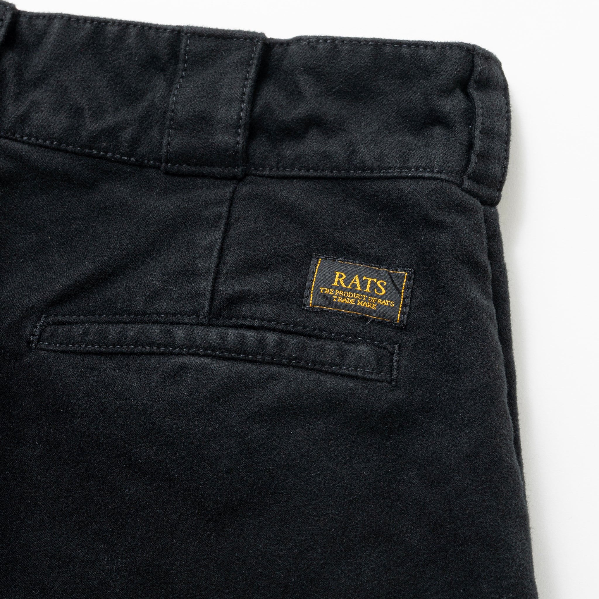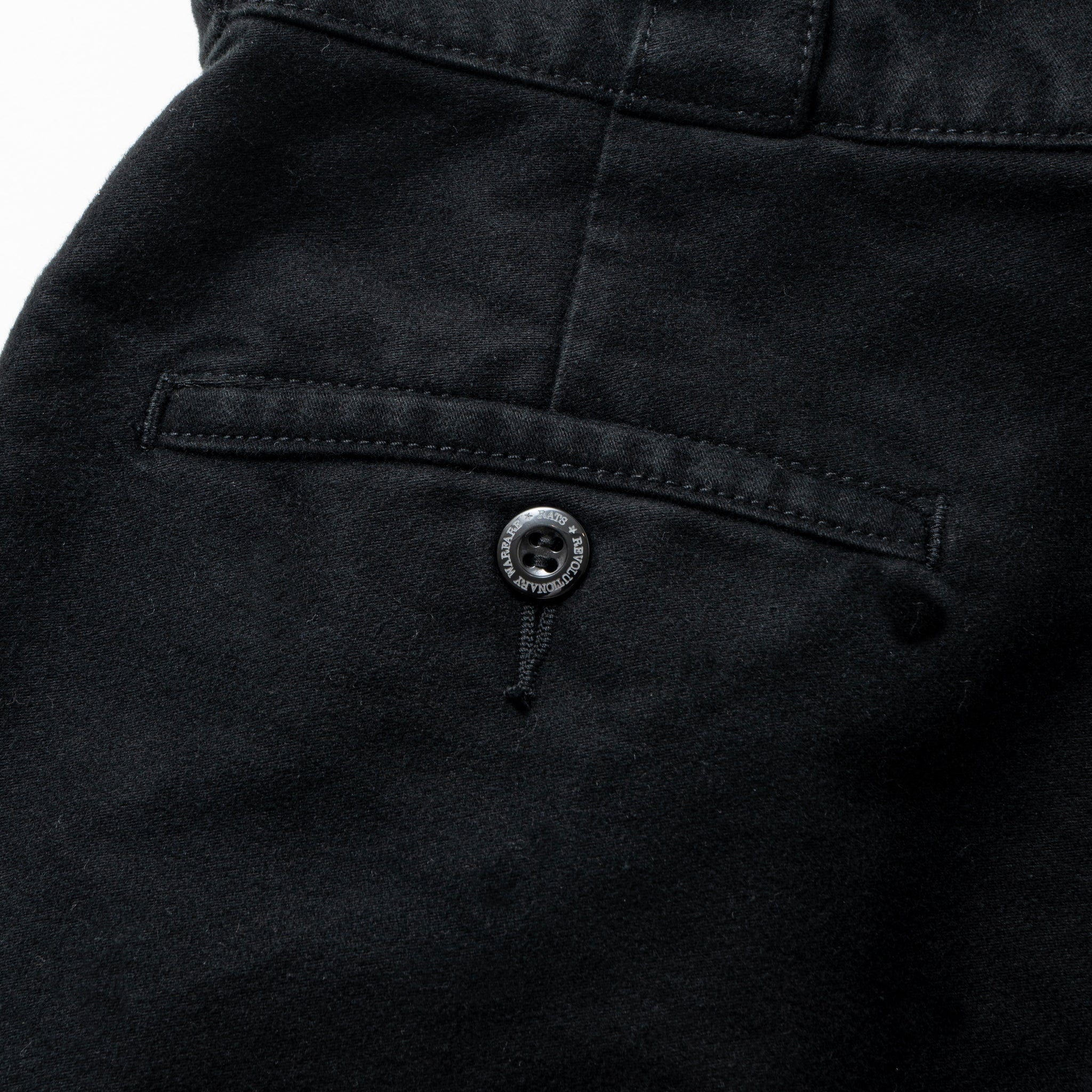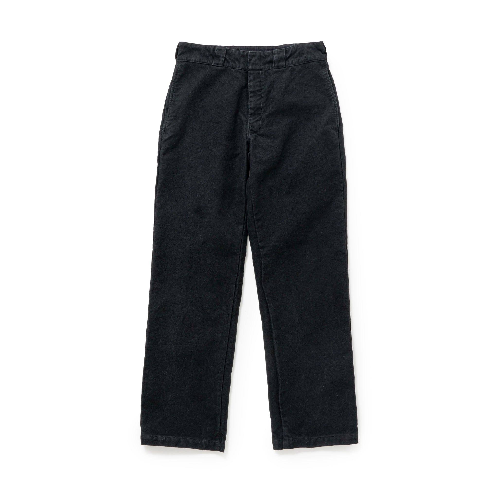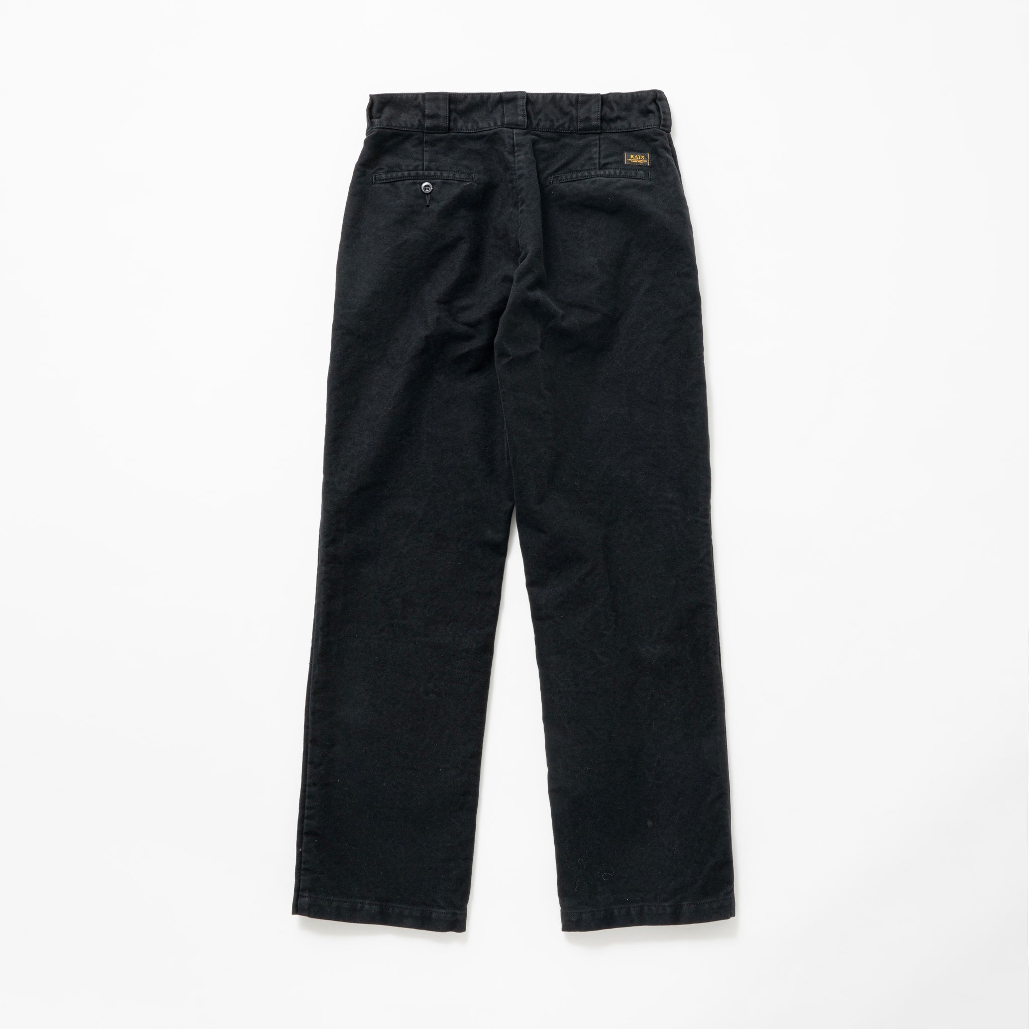 オリジナルのモールスキン生地を使用したワークパンツ。太さのあるベルトループはスタッズベルトを通すことが出来る幅。背面ポケット上にレクタングルタグ、腰・腿周りにゆとりのあるストレートシルエット。製品でワンウォッシュ済み。15サイズ展開。